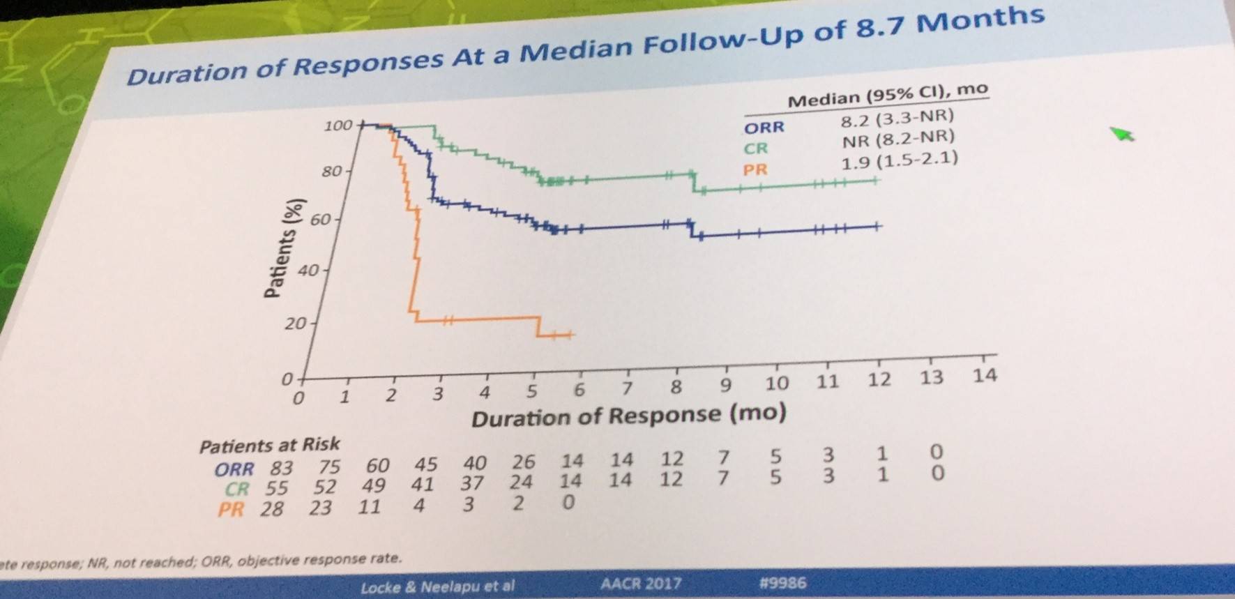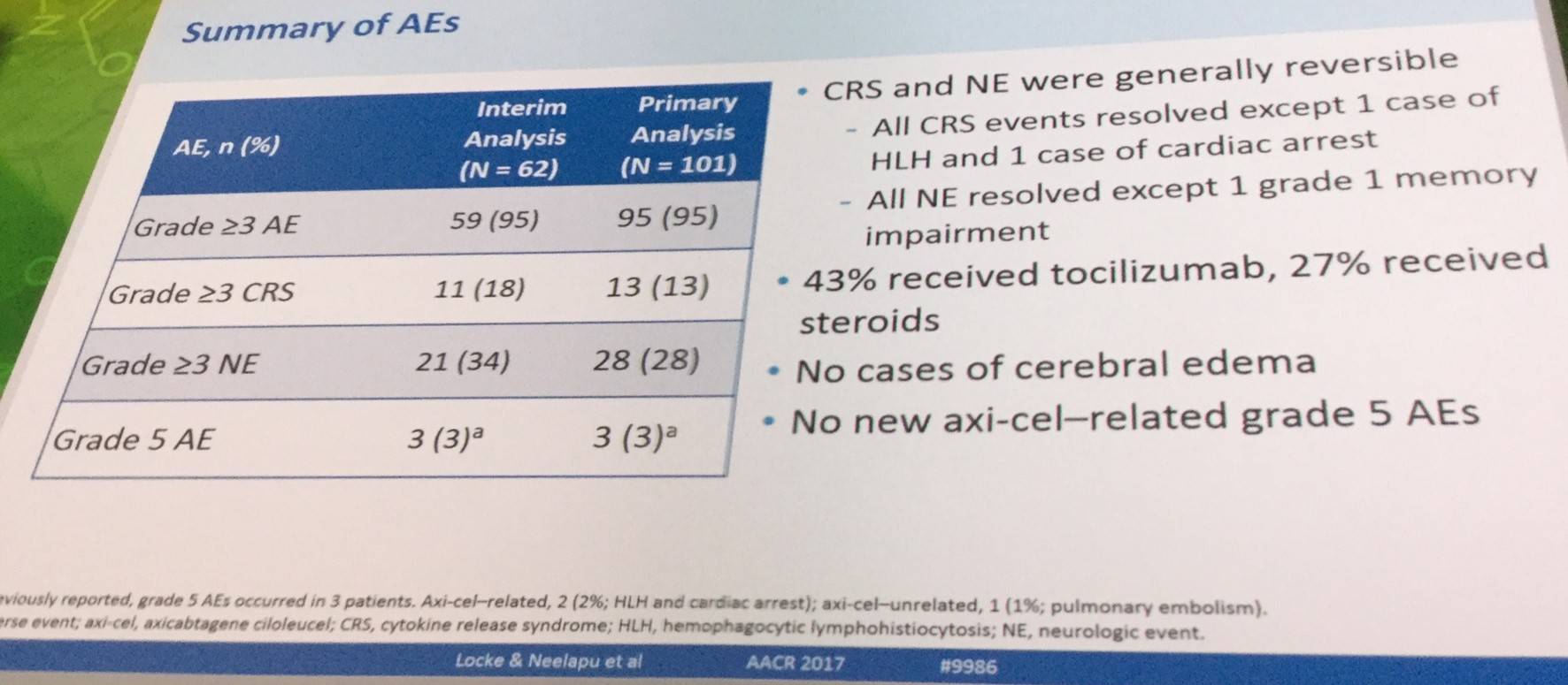 On Sunday 2nd April, during the “CTSY02 - Immuno-oncology Biomarkers in Clinical Trials” session at AACR 2017, Frederick L. Locke, MD, of the H. Lee Moffitt Cancer Center & Research Institute, Tampa, FL, gave a talk titled “Primary results from ZUMA-1: a pivotal trial of axicabtagene ciloleucel (axicel; KTE-C19) in patients with refractory aggressive non-Hodgkin lymphoma (NHL).”