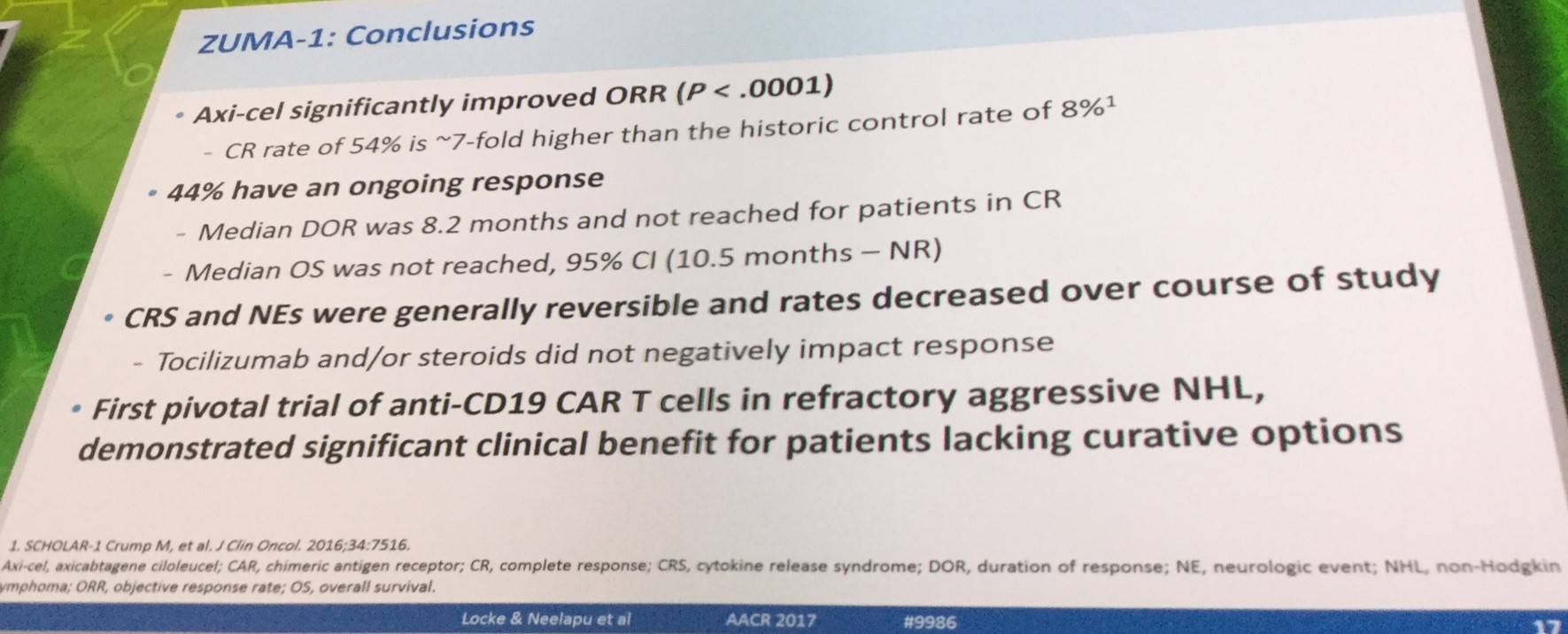 Dr. Locke concluded the talk with a succinct summary slide, emphasizing that ZUMA-1 is the first pivotal trial of CD19-specific CAR T-cell therapy in patients with refractory aggressive NHL.