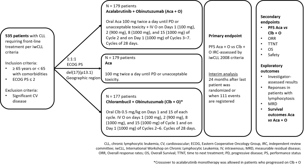 This trial demonstrates the efficacy and safety of acalabrutinib, a selective Bruton’s Tyrosine Kinase inhibitor (BTKi), as first-line treatment for patients with CLL. In the reported interim analysis, receiving acalabrutinib ± obinutuzumab was associated with a statistically significant improvement of PFS over Clb + O.
