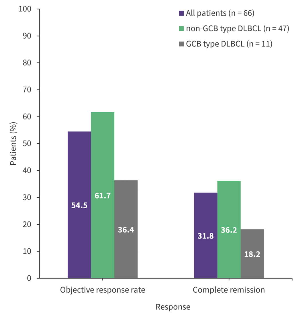 DLBCL, diffuse large B-cell lymphoma; GCB, germinal center B-cell; NOS, not otherwise specified; R2A, acalabrutinib with lenalidomide and rituximab.