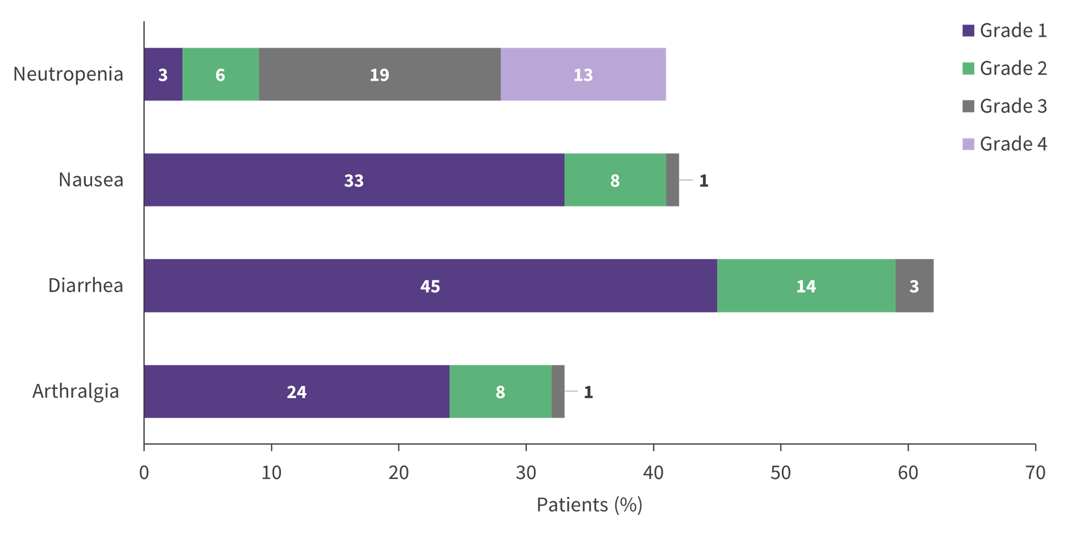 Among AEs of clinical interest, atrial fibrillation of any grade and Grade ≥3 occurred in 4% and 1%, respectively, and major haemorrhage in 2% of patients.