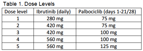 The mechanism-based combination of ibrutinib plus palbociclib is well tolerated and active. Toxicity is primarily related to myelosuppression of grade 1-2 severity, although grade 3 rash was observed at the highest doses evaluated. In this small group of patients, the combination produced responses at all dose levels, with a CR rate of 44% and a median time to CR of 3 months. No responding patients have progressed to date. These preliminary CR, PFS, and RD rates appear better than those reported in other studies of single-agent ibrutinib although the numbers of patients was very small. A phase II multi-center clinical trial to evaluate time to progression is planned. Biomarker studies to evaluate mechanisms of primary resistance are ongoing.