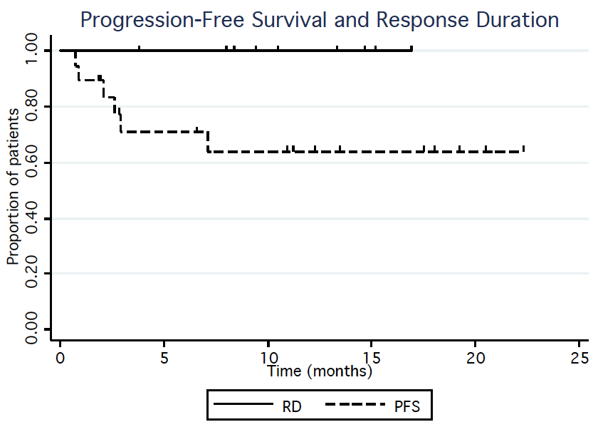 From August 2014 to June 2016 a total of 20 patients (15 males, 5 females) were enrolled (DL1 n=3, DL2 n=3, DL3 n=6, DL4 n=3, DL5 n=5). The patients' MIPI risk distribution were 7 low, 7 intermediate, and 6 high. The median number of prior therapies was 1 (range 1-5). Six patients were refractory to their last prior therapy. Three patients experienced dose limiting toxicity: One patient treated at DL3 experienced grade 4 thrombocytopenia lasting more than 7 days, and grade 3 rash was seen in two patients at DL5. Grade 3-4 hematological toxicity included thrombocytopenia (28%), neutropenia (22%), and lymphopenia (17%). Grade 3-4 non-hematological toxicity regardless of attribution included one patient with each of the following: lung infection, ALT/AST increase, encephalitis, hyponatremia, sinus tachycardia, pneumonitis. Grade 1-2 adverse events related to treatment and occurring in at least 2 patients included the following: diarrhea (50%), fatigue (44%), rash (39%), bruising (17%), nausea (17%), fever (11%), dyspepsia (11%), and myalgia (11%). Other than the two patients that experienced grade 3 rash at DL5, no patients have required dose reductions; 6 patients required dose interruptions. Thirteen subjects continue on study therapy. The reasons for stopping treatment were disease progression (n=4), adverse event (elevated liver enzymes, n=1; and prolonged cytopenias, n=1), and allogeneic stem cell transplantation (n=1). Of the 18 patients that have had at least one response evaluation to date, 12 (67%) patients responded to treatment and 8 (44%) achieved a CR. The median time to CR was 3 cycles and no responding patients have progressed on study. With a median follow up of 11 months, the estimated 1-year PFS and RD are 68% and 100%, respectively (Figure 1).
