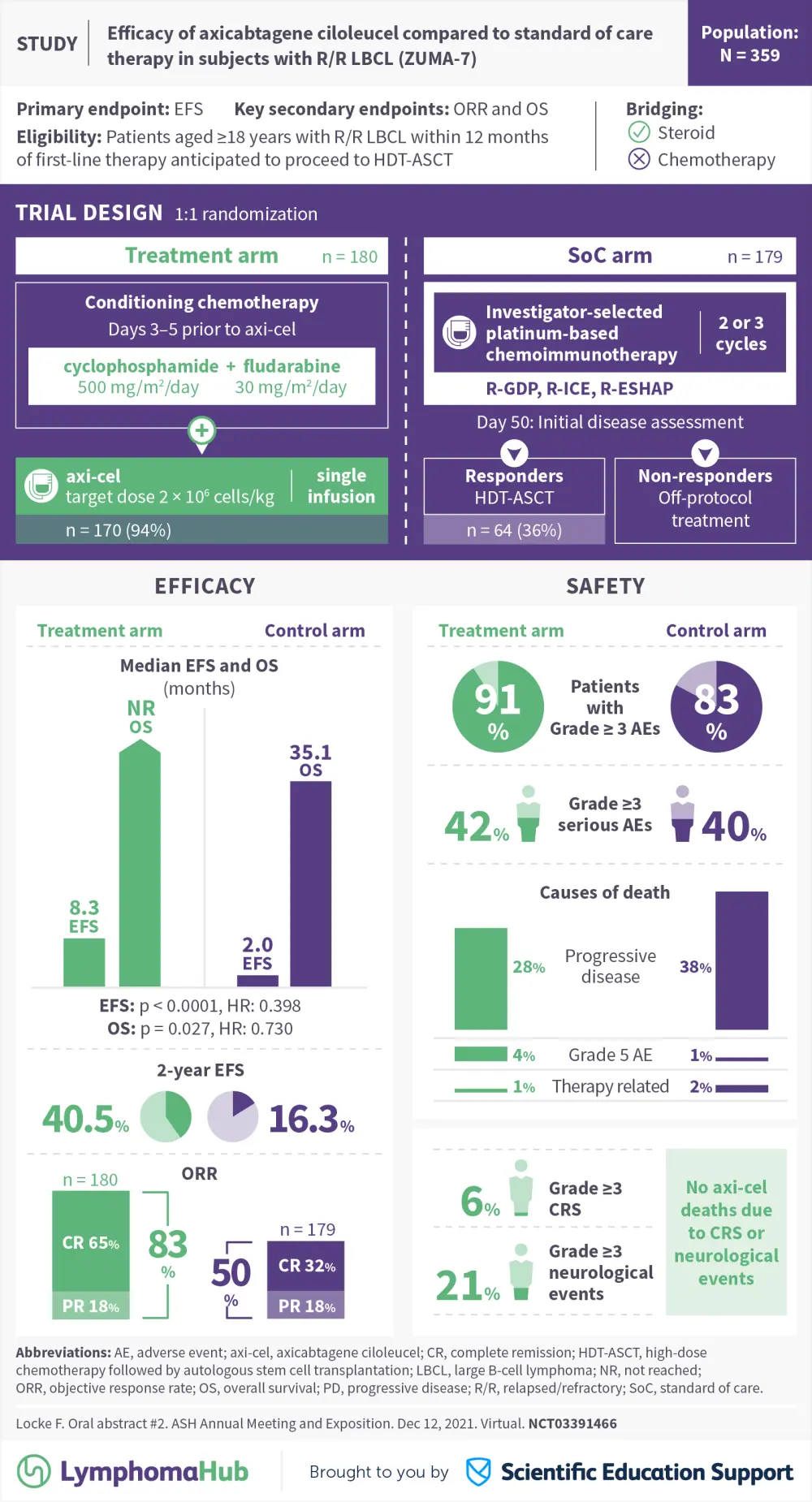 The Lymphoma Hub is happy to present a Visual Abstract representing key data from the primary analysis of the phase III ZUMA-7 study (NCT03391466), evaluating the clinical efficacy of axicabtagene ciloleucel versus standard-of-care second-line therapy in adult patients with relapsed/refractory large B-cell lymphoma.