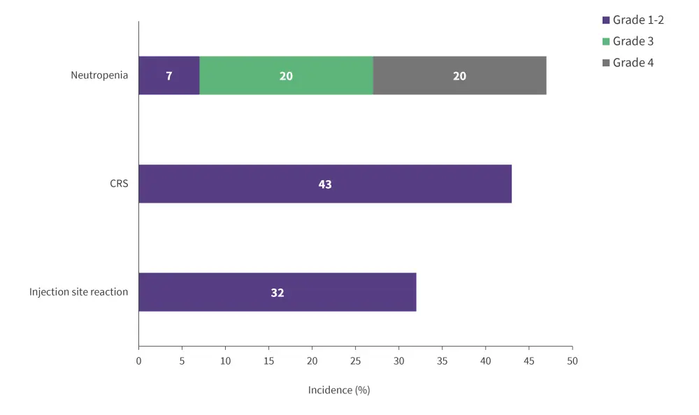 The most common TEAEs observed in ≥20% of patients were neutropenia, followed by CRS, and injection-site reaction (Figure 2); the latter two are likely to be directly related to epcoritamab. All CRS events were Grade 1–2 and resolved after a median of 2 days, with eight patients treated with tocilizumab and none resulting in treatment discontinuation. Most CRS cases occurred after the first full dose of epcoritamab.