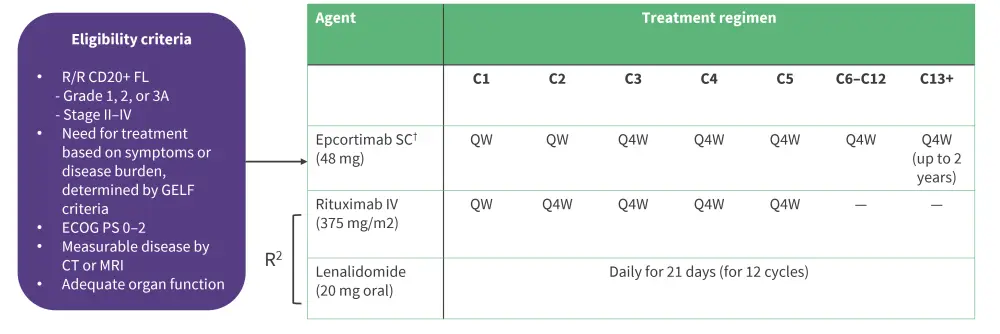 C, cycle; GELF, Groupe d'Etude des Lymphomes Folliculaires intravenous; QW, once weekly; Q4W, once every 4 weeks; R2, rituximab plus lenalidomide; SC, subcutaneous.