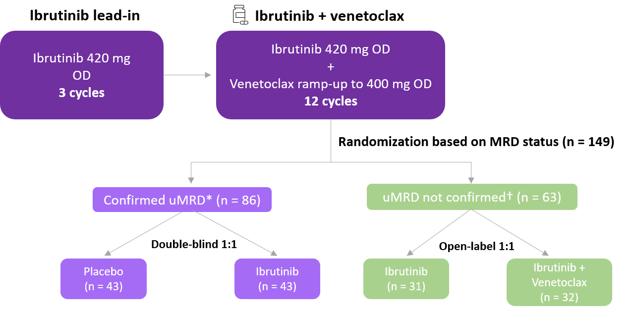 The primary endpoint was 1-year disease-free survival (DFS) rate in patients with confirmed undetectable MRD (uMRD) who were randomized to placebo versus ibrutinib to investigate if remission could be achieved without treatment in uMRD settings. DFS was defined as no MRD relapse (≥ 10−2 confirmed at two separate timepoints) and no disease progression or death. Key secondary endpoints included uMRD, response, progression-free survival (PFS), tumor lysis syndrome (TLS) risk reduction, and safety.