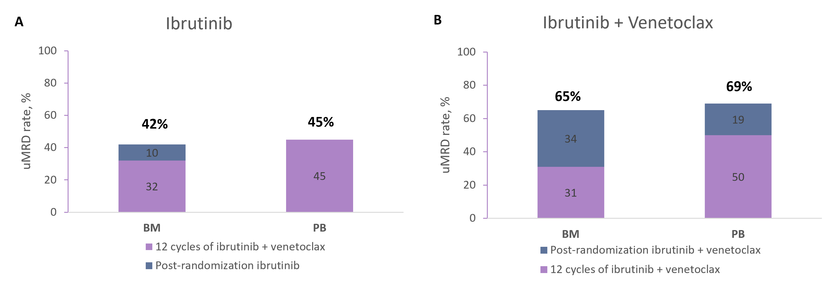A uMRD rates after 12 cycles of ibrutinib + venetoclax treatment and subsequent ibrutinib treatment, and B uMRD rates after 12 cycles of ibrutinib + venetoclax treatment and subsequent ibrutinib + venetoclax treatment.