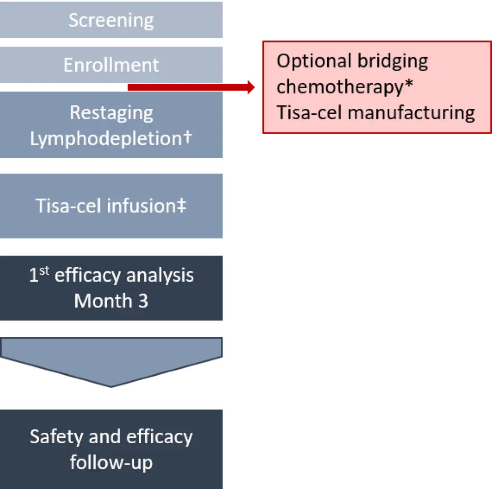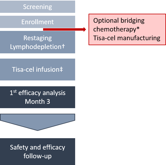 ‡Dose range: 0.6–6 × 108 CAR+ viable T cells in a single IV infusion.