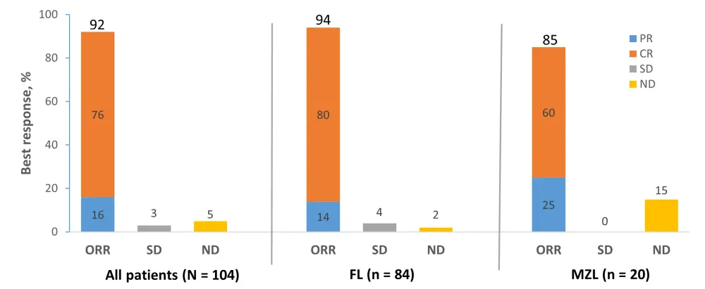 CR, complete response; FL, follicular lymphoma; MZL, marginal zone lymphoma; ND, undefined/not done; ORR, objective response rate; PR, partial response; SD, stable disease.