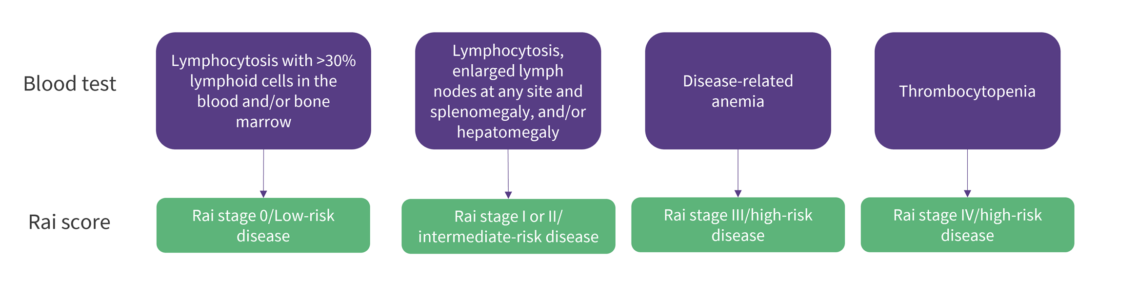 There are two staging systems used to determine the stage of disease: the Rai staging system and the Binet staging system.9 The stages in the Rai staging system are defined in Figure 4.