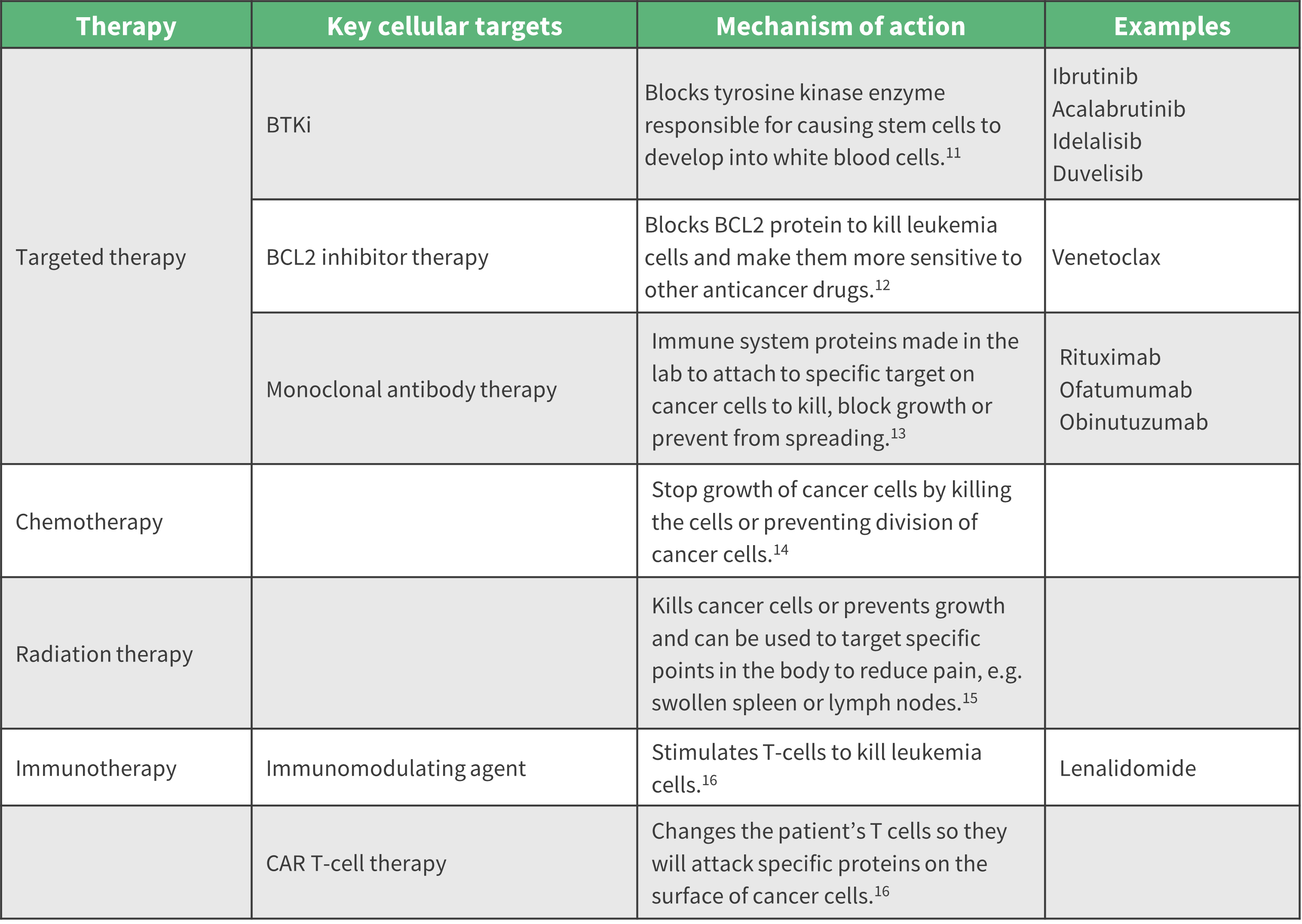 The treatment landscape for CLL has progressed in the last decade. The previously recommended chemotherapeutic agents in combination with a monoclonal antibody have been replaced by targeted agents, such as BTKi and BCL2 inhibitors.10 Figure 6 summarizes the available types of therapy and their cellular targets.