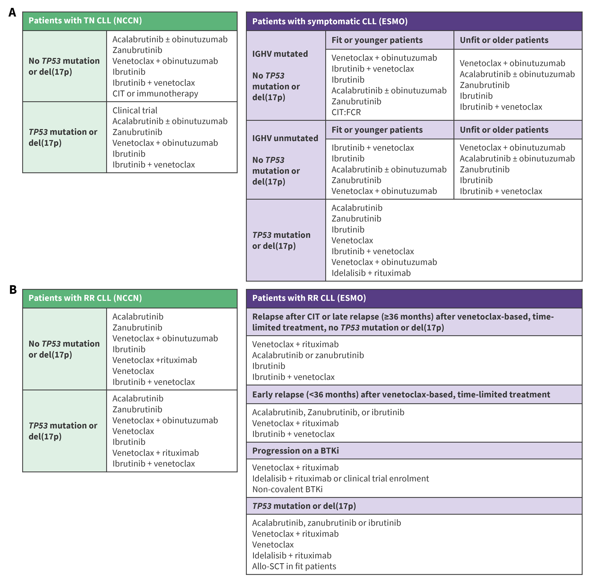 allo-SCT, allogeneic stem cell transplantation; BTKi, Bruton’s tyrosine kinase inhibitor; CIT, chemoimmunotherapy; CLL, chronic lymphocytic leukemia; del, deletion; ESMO, European Society for Medical Oncology; FCR, fludarabine, cyclophosphamide, rituximab; IGHV, immunoglobulin heavy chain variable; mAb, monoclonal antibody; NCCN, National Comprehensive Cancer Network; RR, relapsed/refractory; TN, treatment-naïve.