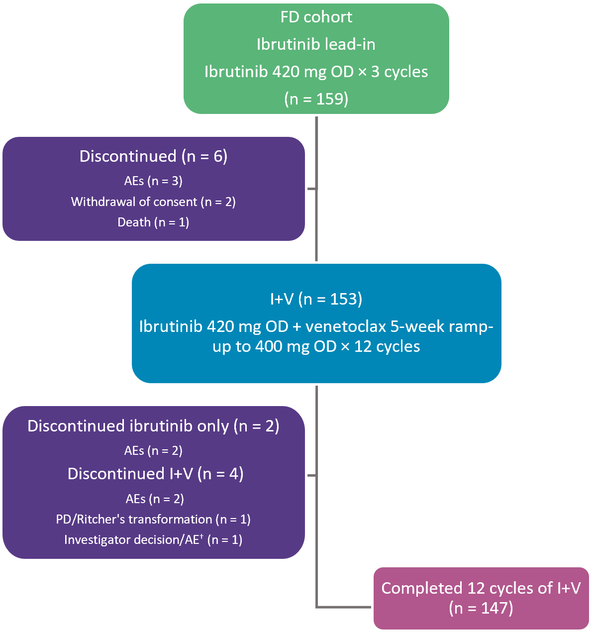 AEs, adverse events; FD, fixed-duration; I+V, ibrutinib + venetoclax; OD, once daily; PD, progressive disease.