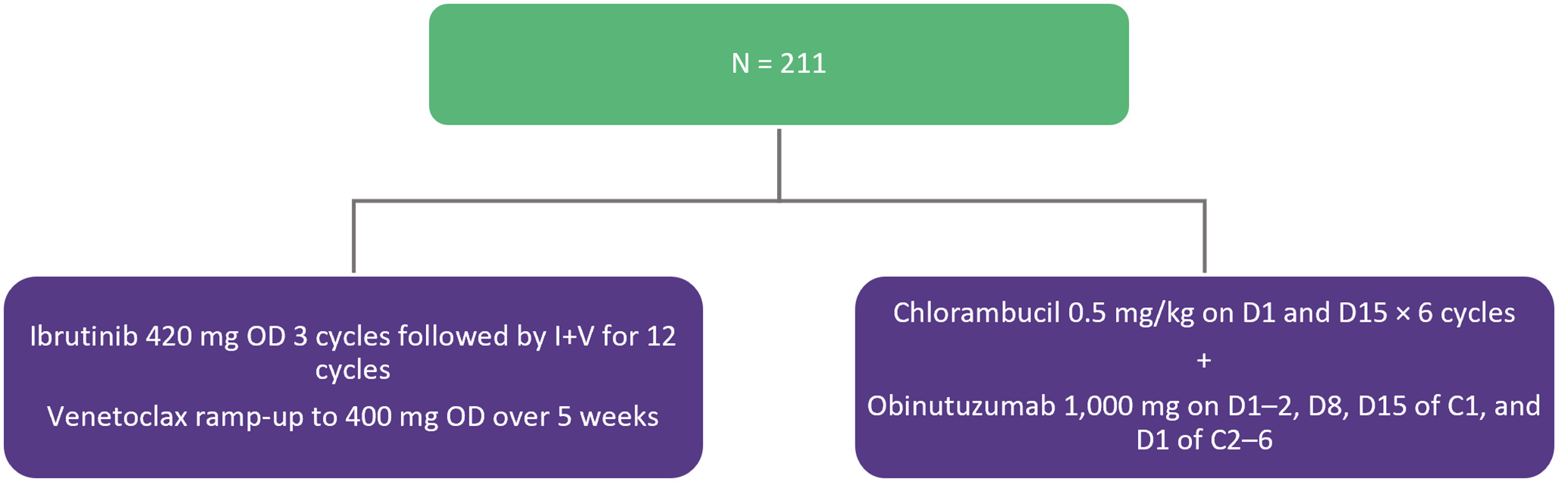 The phase III GLOW trial enrolled 211 patients with previously untreated CLL/SLL. Patients were ≥65 years of age or 18–64 years of age and unfit (cumulative illness rating scale >6 or creatinine clearance <70 mL/min). Eligible patients had Eastern Cooperative Oncology Group performance status (ECOG PS) of 0–2 and no del(17p) or known TP53 mutations and were stratified by immunoglobulin heavy chain variable region gene (IGHV) status and presence of del(11q). Patients were randomized as shown in Figure 1.