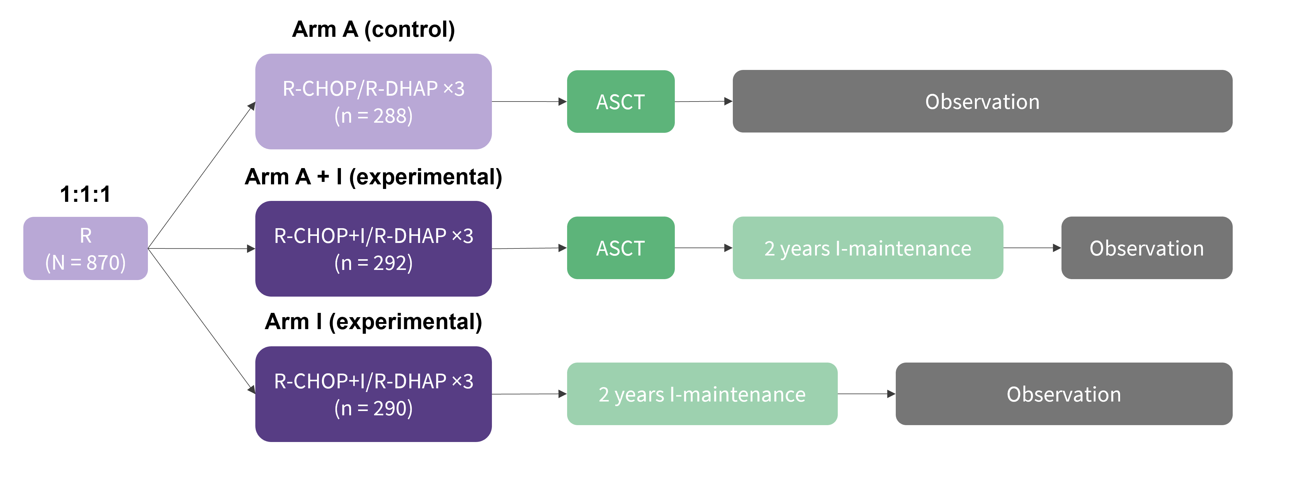 TRIANGLE is an ongoing phase III, randomized, open-label, three-arm trial of ibrutinib to compare the effectiveness and safety of adding ibrutinib to standard treatment (arm A + I) vs previous standard treatment (arm A) and an ibrutinib containing treatment without ASCT (arm I) (Figure 1).