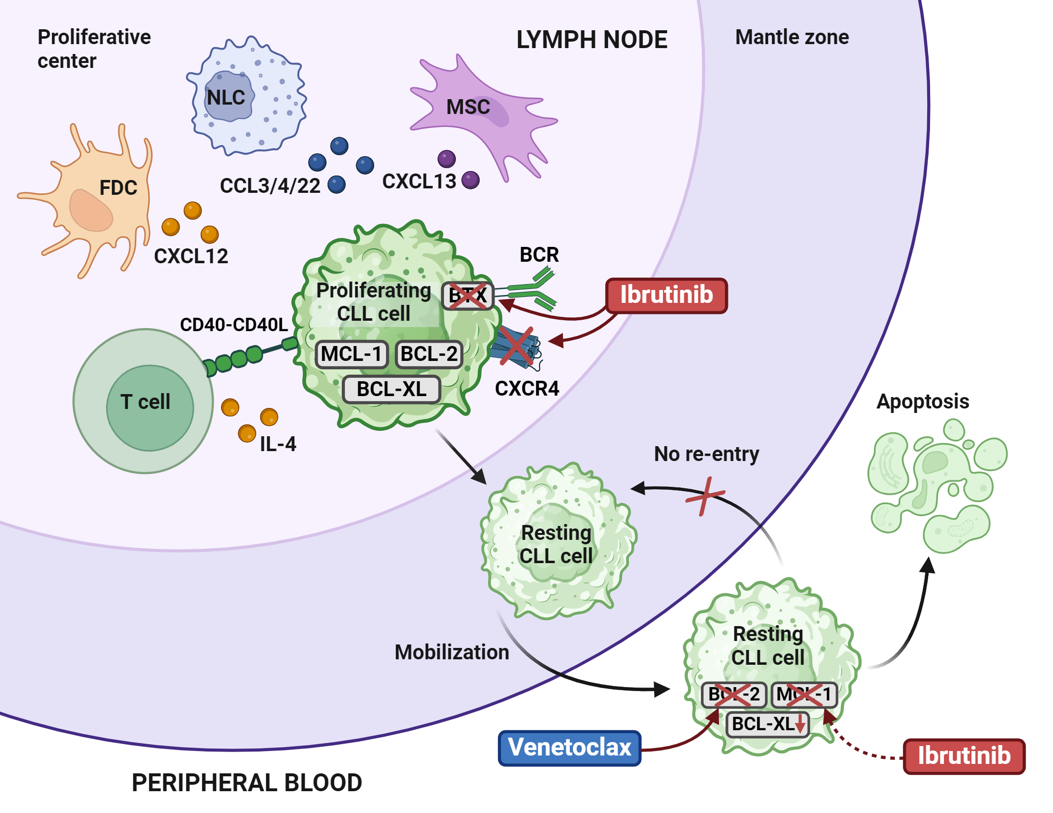 BCR, B-cell receptor; CLL, chronic lymphocytic leukemia; CCL3/4/22, C-C motif chemokine ligands 3, 4, and 22; CXCL12/13, chemokine C-X-C motif ligands 12 and 13; CXCR4, C-X-C chemokine receptor type; FDC, follicular dendric cell; MSC, mesenchymal stem cell; NLC, nurse-like cell.