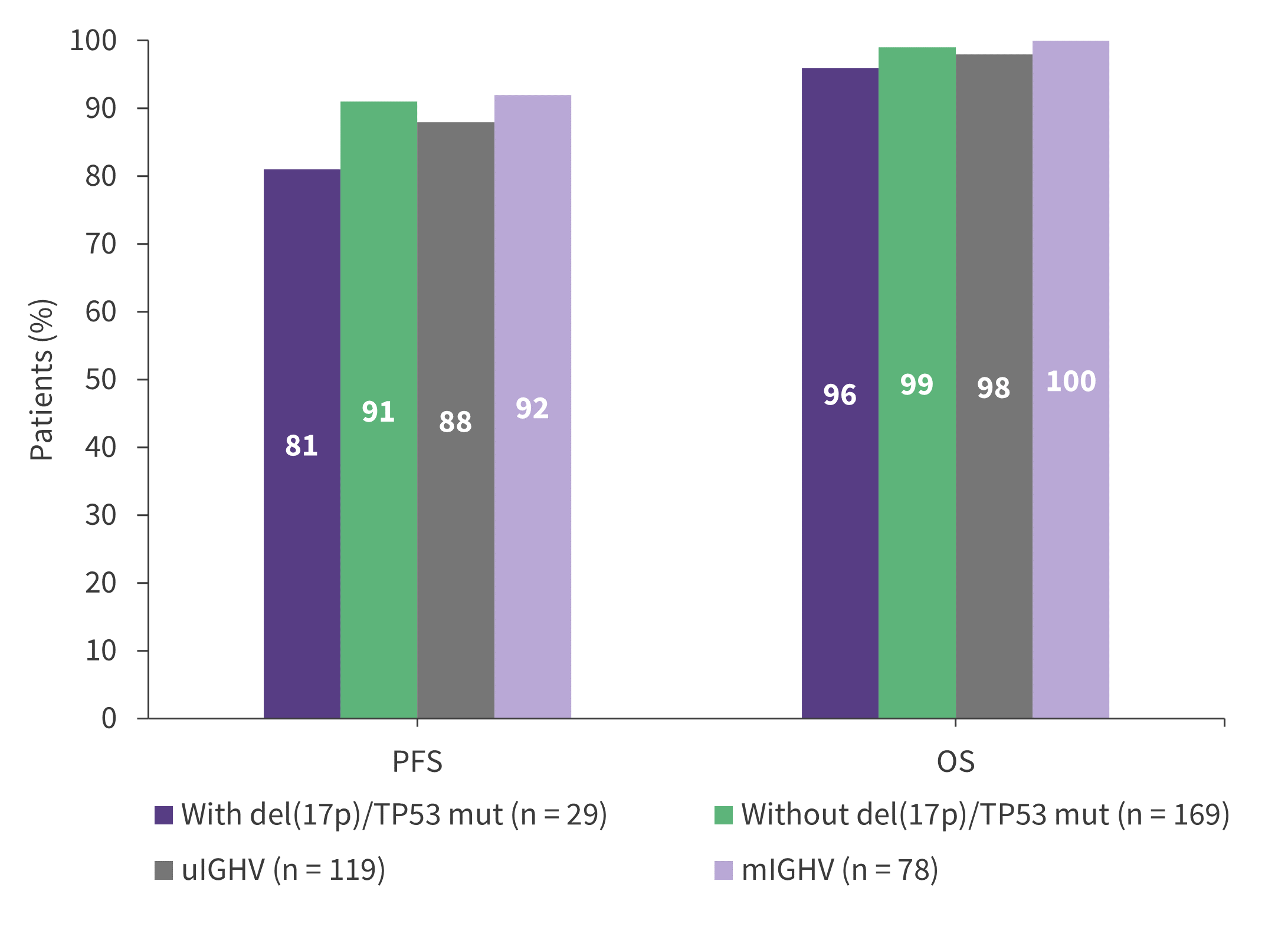 mIGHV, mutated IGHV; OS, overall survival; PFS, progression-free survival; TP53mut, mutated TP53; uIGHV, unmutated IGHV.