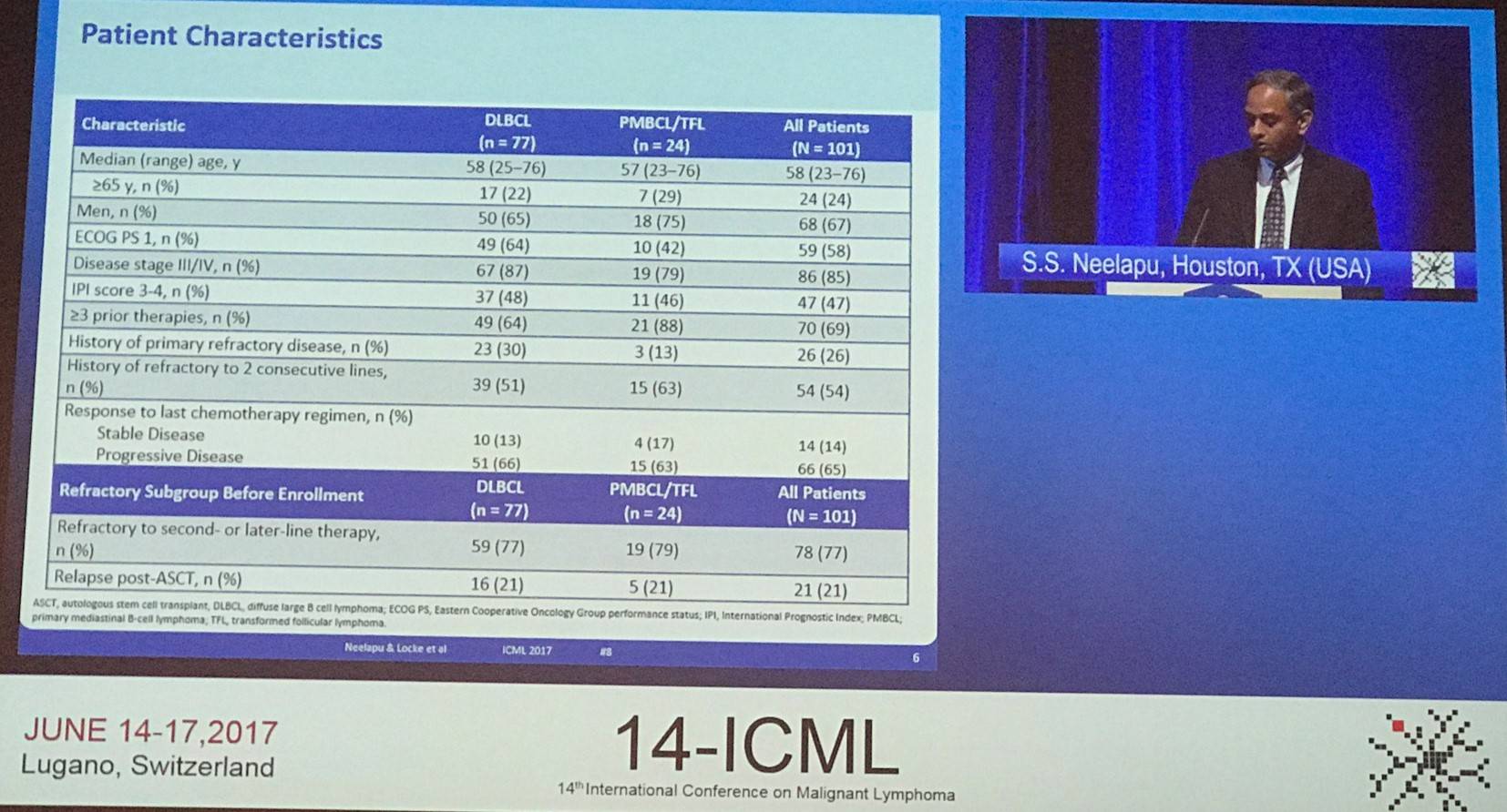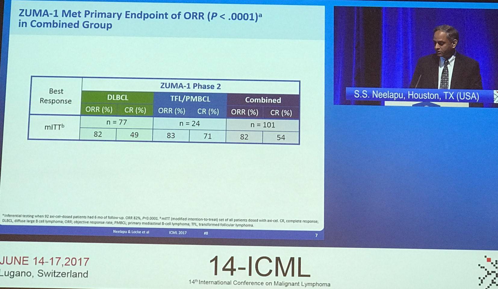 The second talk during this session discussed primary results from the pivotal phase I/II ZUMA-1 trial (NCT02348216) of KTE-C19 in patients with refractory DLBCL and was presented by Sattva S. Neelapu from The University of Texas MD Anderson Cancer Center, Houston, USA.