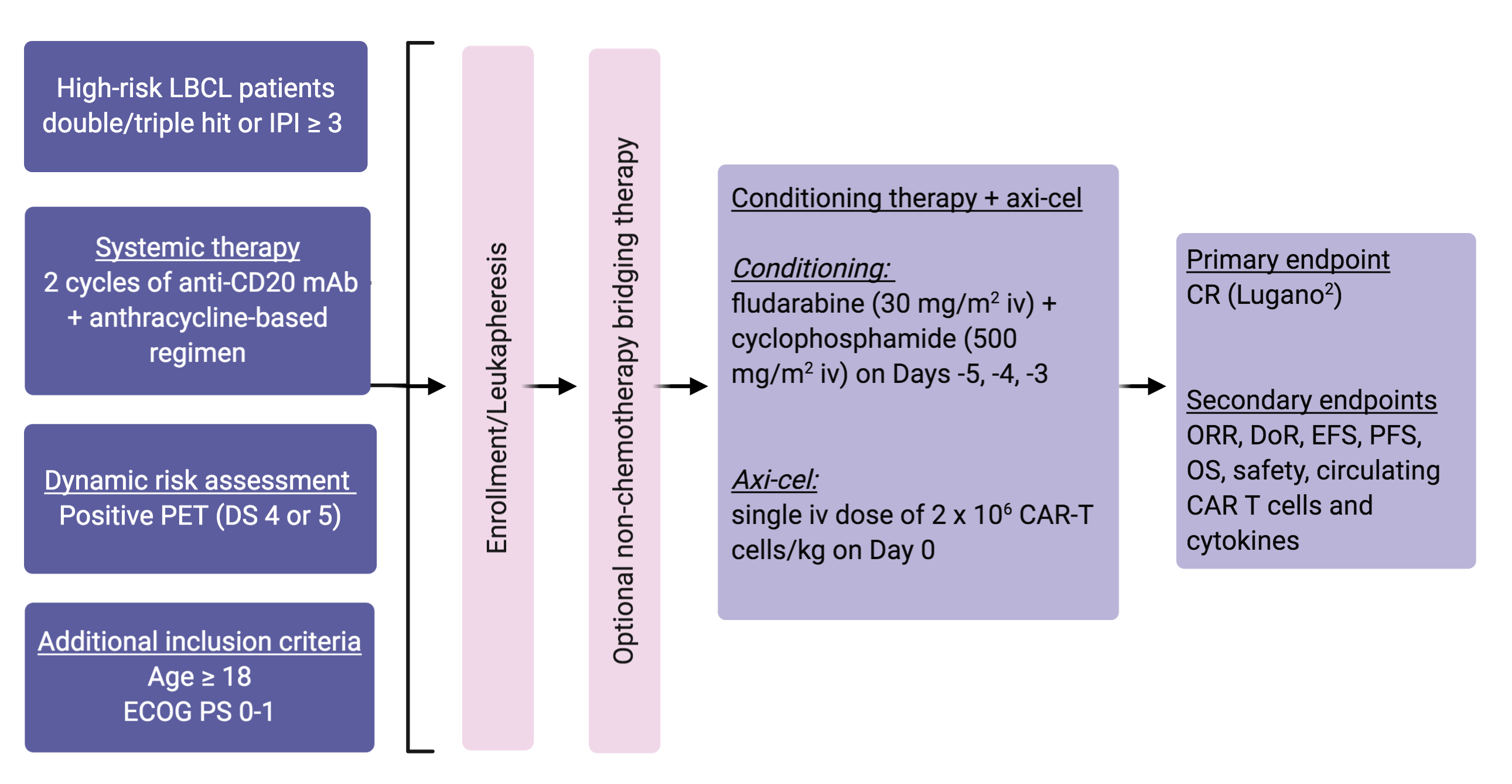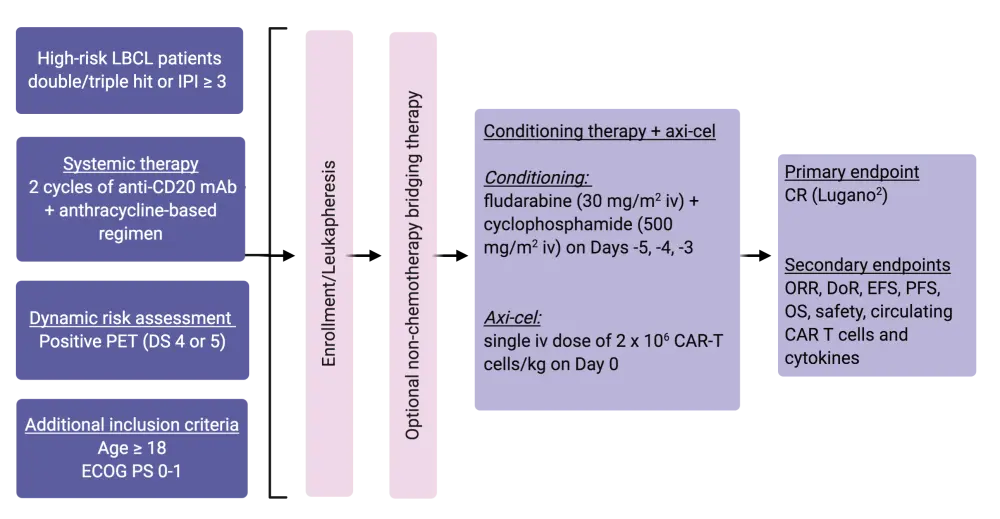 Axi-cel, axicabtagene ciloleucel; CAR, chimeric antigen receptor; CR, complete response; DoR, duration of response; DS, Deauville score; ECOG PS, Eastern Cooperative Oncology Group performance score; EFS, event-free survival; IPI, International Prognostic Index; iv, intravenous; LBCL, large B-cell lymphoma; mAb, monoclonal antibody; ORR, overall response rate; OS, overall survival, PET, positron emission tomography; PFS, progression-free survival.