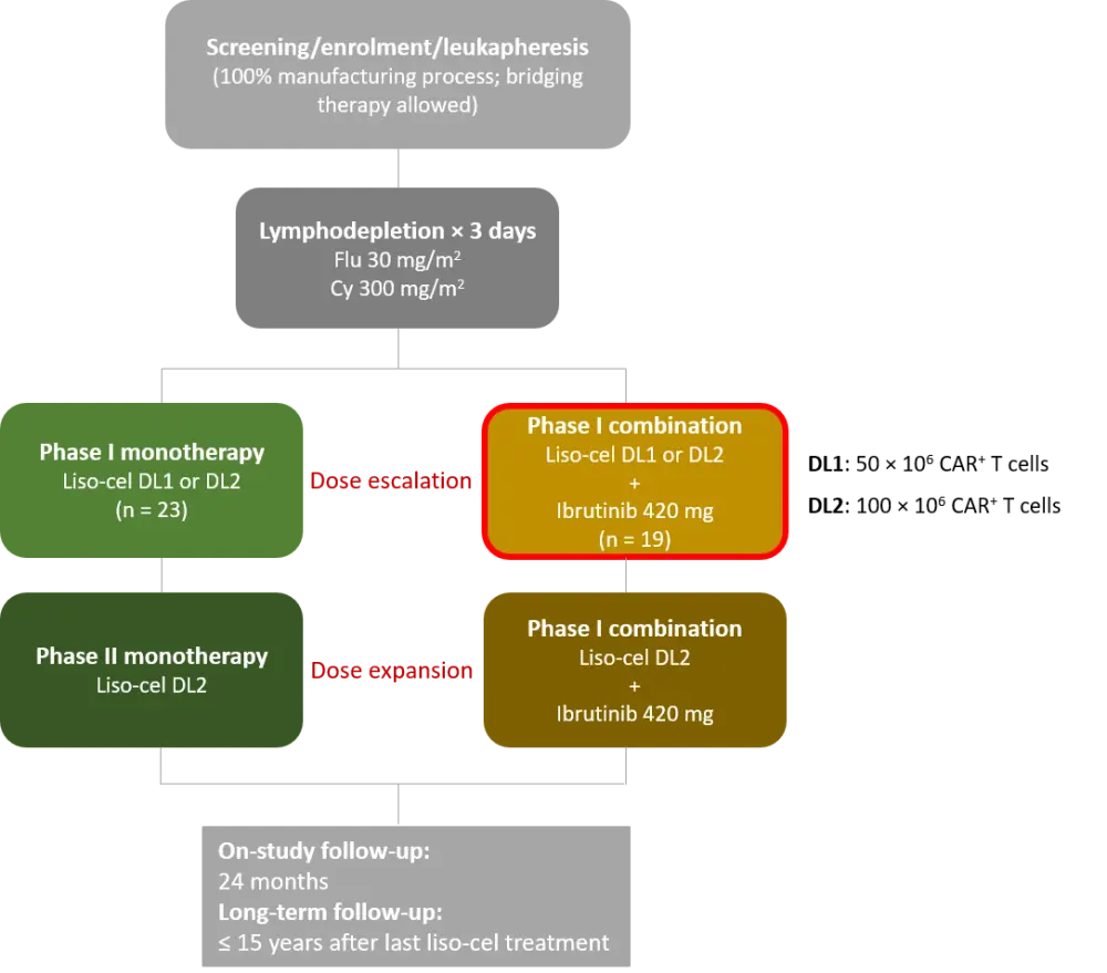 In this study, patients with R/R CLL/SLL received lymphodepleting chemotherapy followed by liso-cel infusion. Results from the phase I combination cohort (outlined in red in Figure 1) were presented. The results of the phase I monotherapy arm (n = 23) were previously summarized here.