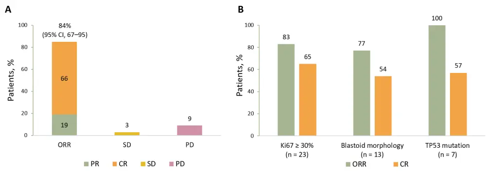 A Best overall response in all patients (N = 31); B Response rates in patients with high-risk features.