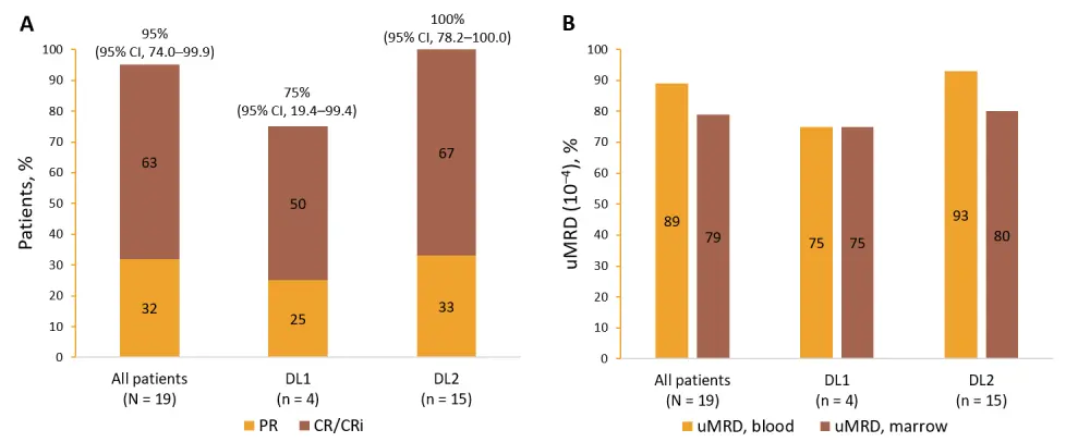 CI, confidence interval; CR, complete response; CRi, CR with incomplete hematologic recovery; DL, dose level; PR, partial response; uMRD, undetectable minimal residual disease (≤ 10-4).