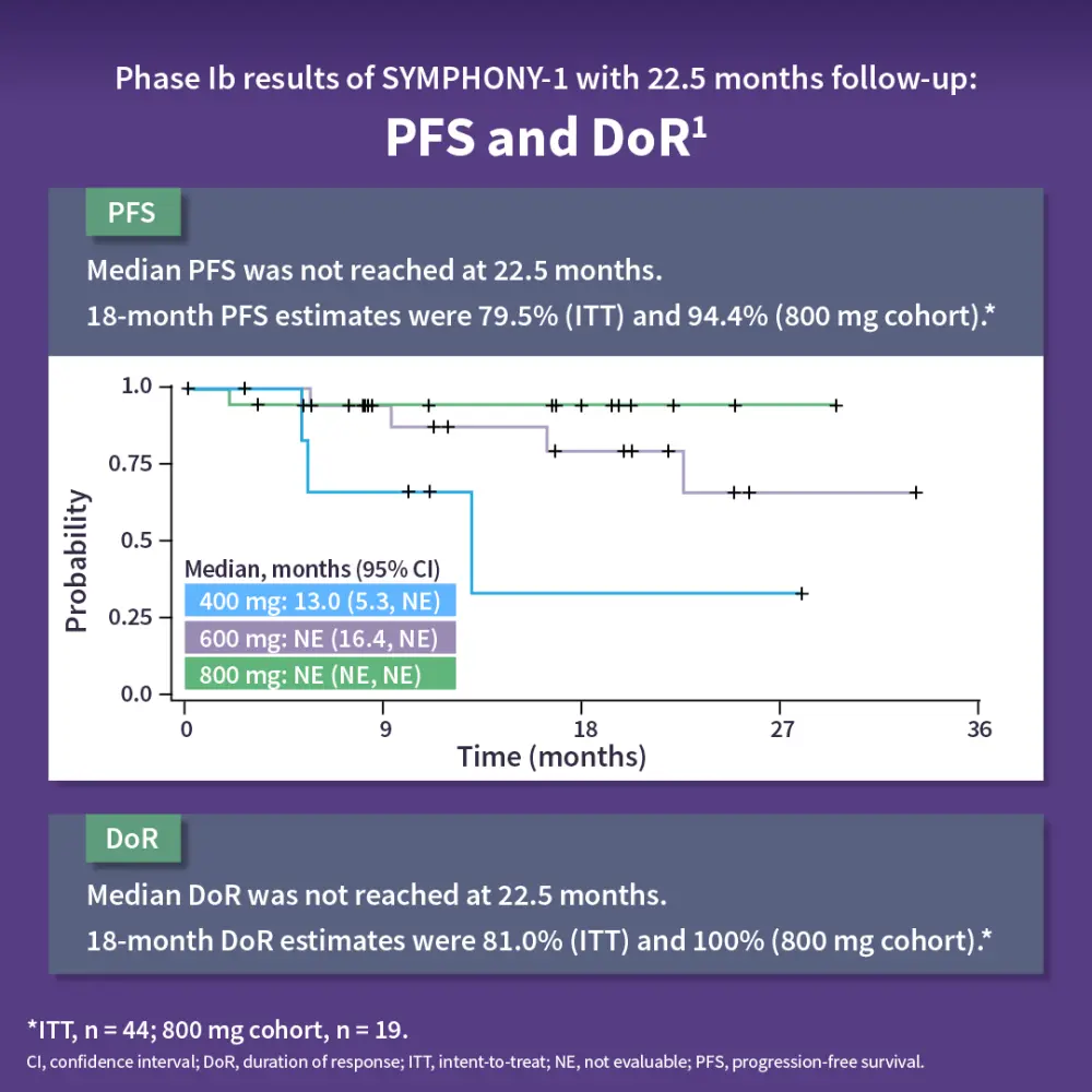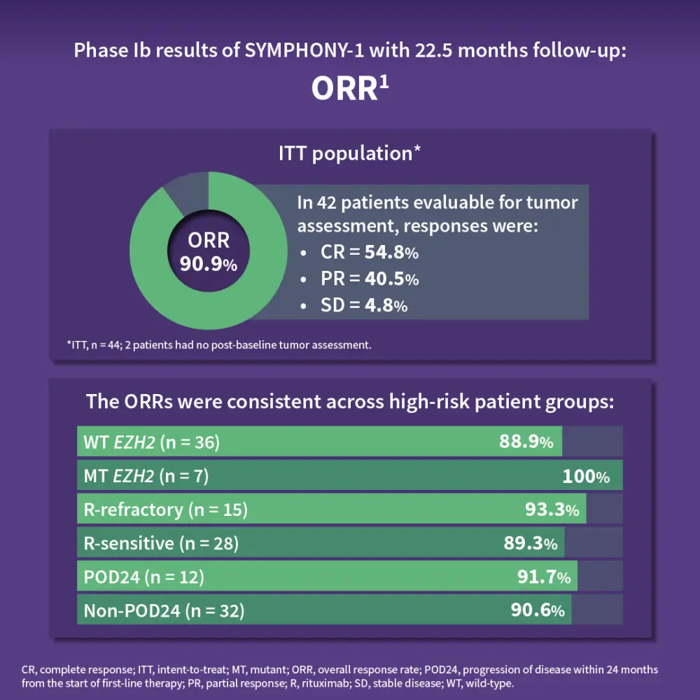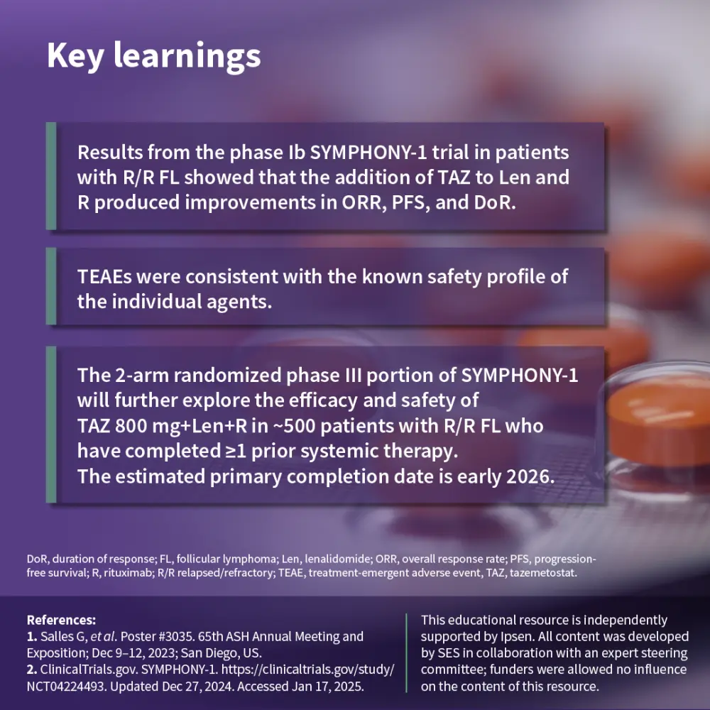The SYMPHONY-1 trial is a phase Ib/III, double blind, placebo-controlled study of tazemetostat with lenalidomide and rituximab in R/R FL. The primary endpoints were to determine recommended phase III dose and progression-free survival in patients with wild-type and EZH2mut R/R FL.1,2 Results showed that the combination was well tolerated, with an 800 mg twice daily dose of tazemetostat recommended for phase III. At 22.5 months, the overall response rate was 90.9%, with a complete response rate of 54.8%. The ORR was consistent across subgroups, including patients with wild-type or EZH2mut and those who were rituximab refractory or sensitive. The median progression-free survival and duration of response were not reached, with 18-month PFS estimates of 79.5% (intent-to-treat) and 94.4% (800 mg cohort). The safety profile was consistent with prior data, with neutropenia as the most common severe adverse event. The phase III trial enrolling ~500 patients is ongoing, with primary completion expected in early 2026.1