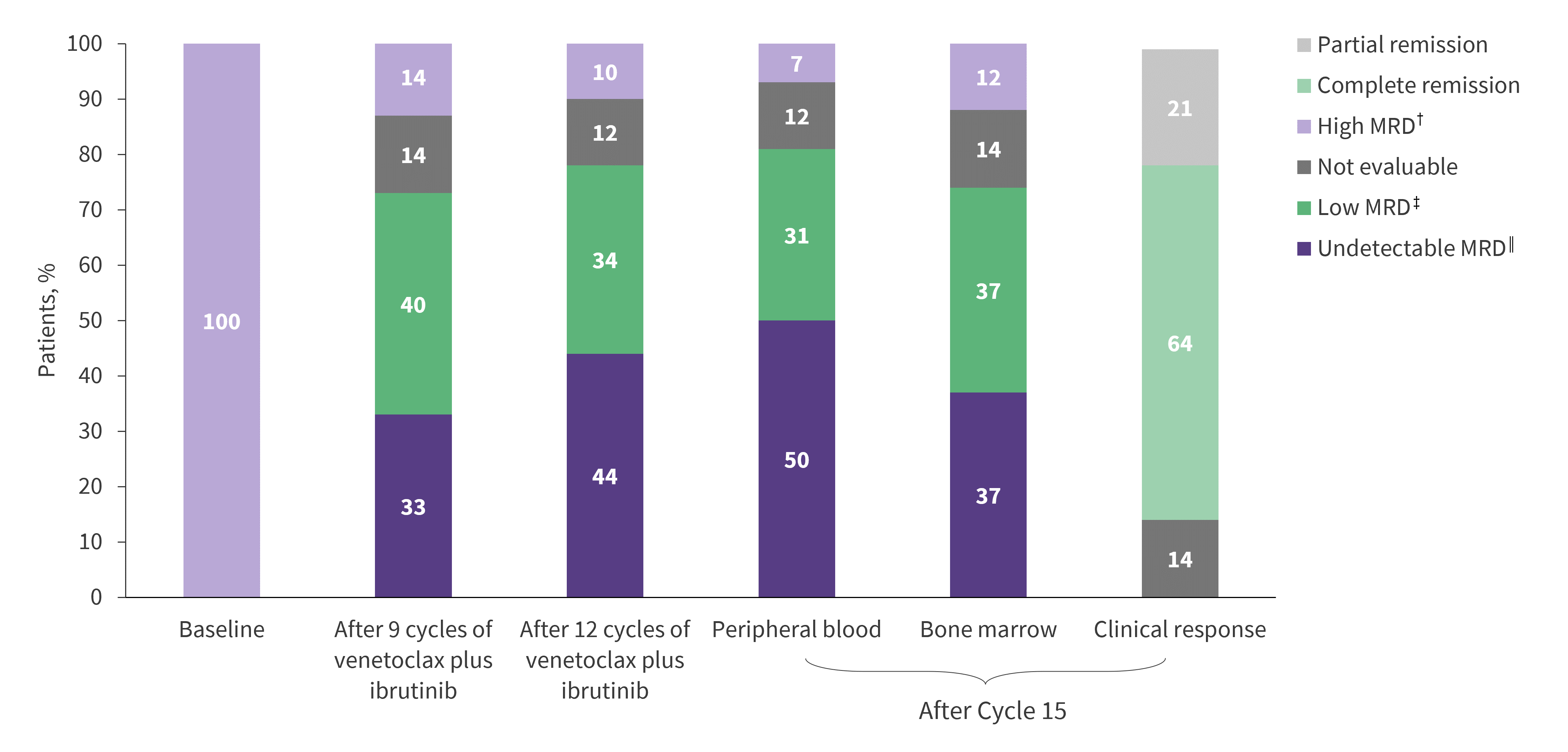 Planned treatment with ibrutinib plus venetoclax, until random assignment at Cycle 15, was completed by 84% of patients. At Cycle 15, 36% of patients in the intention-to-treat population had uMRD in both peripheral blood and bone marrow (Figure 2).
