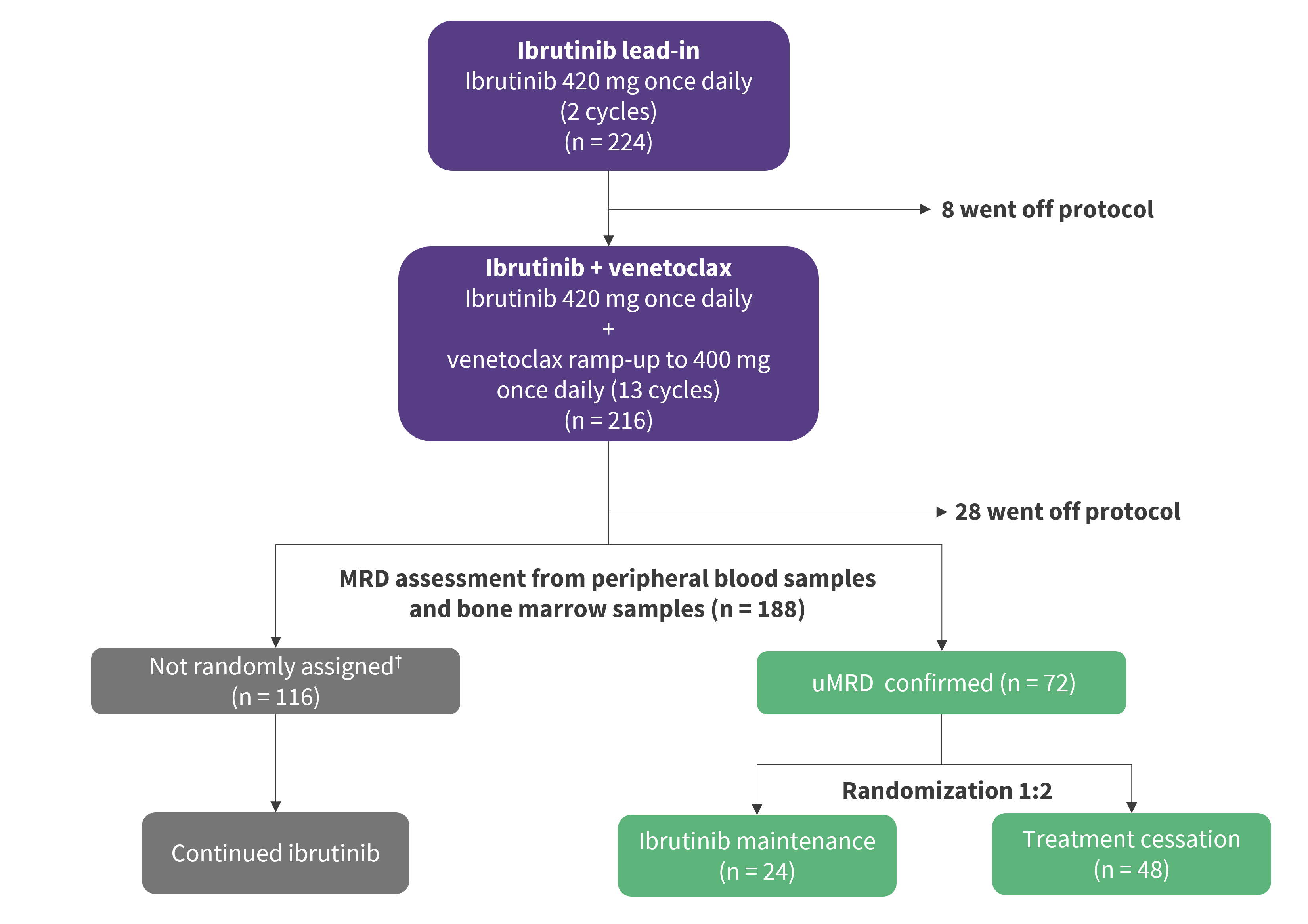 Patients with undetectable MRD (uMRD) after 15 cycles of ibrutinib plus venetoclax were randomly assigned (1:2) to continue or stop ibrutinib treatment (Figure 1). The primary endpoint was 27-month progression-free survival (PFS) in the treatment cessation group.