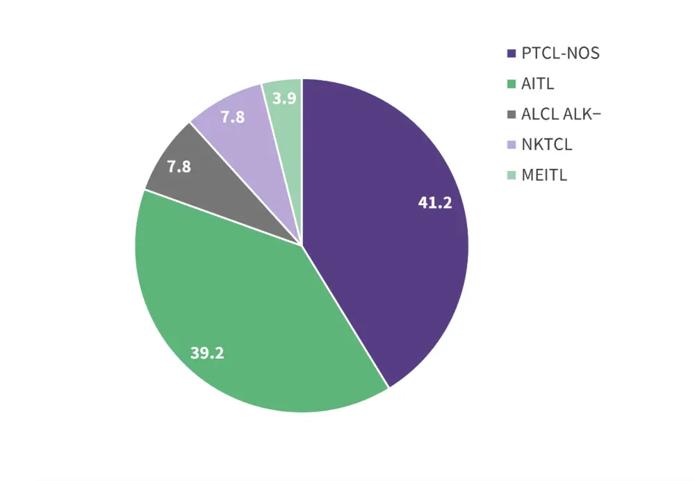 AITL, angioimmunoblastic T-cell lymphoma; ALCL ALK-, anaplastic lymphoma kinase-negative anaplastic large cell lymphoma; MEITL, monomorphic epitheliotropic intestinal T-cell lymphoma; NKTCL, extranodal-nasal/natural killer T-cell lymphoma; NOS, not otherwise specified; PTCL, peripheral T-cell lymphoma.