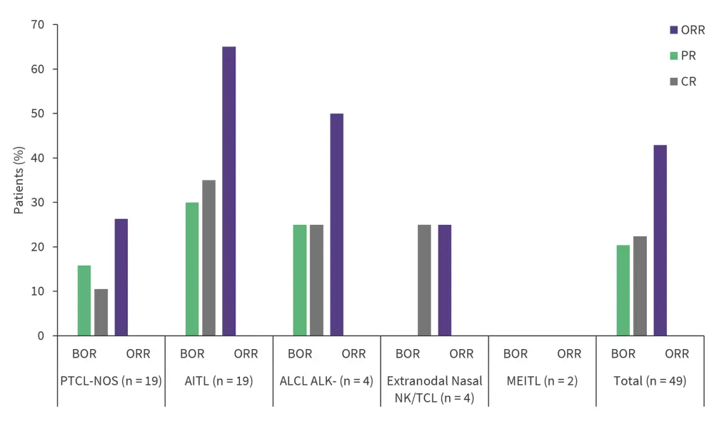 AITL, angioimmunoblastic T-cell lymphoma; ALCL ALK-, anaplastic lymphoma kinase-negative anaplastic large cell lymphoma; CR, complete response; MEITL, monomorphic epitheliotropic intestinal T-cell lymphoma; NK/TCL, natural killer/T-cell lymphoma; NOS, not otherwise specified; ORR, overall response rate; PR, partial response; PTCL, peripheral T-cell lymphoma not otherwise specified.