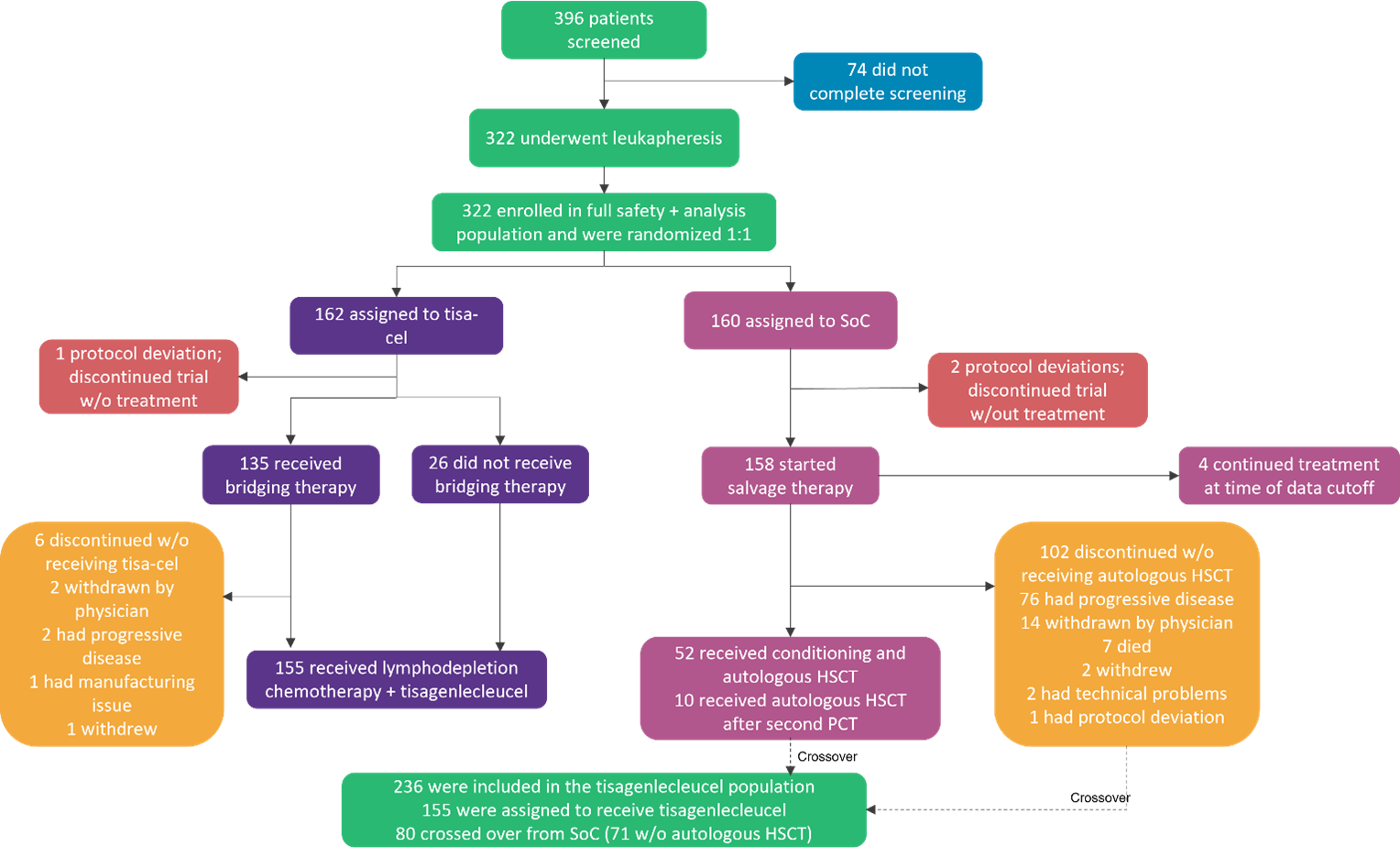 Of the 396 patients who were screened, 322 underwent randomization. All screened patients underwent leukapheresis for lymphocyte collection due to the crossover design of the trial. Due to the transplant eligibility requirement, most patients were under 65 years of age. Patient characteristics are listed in Table 1.