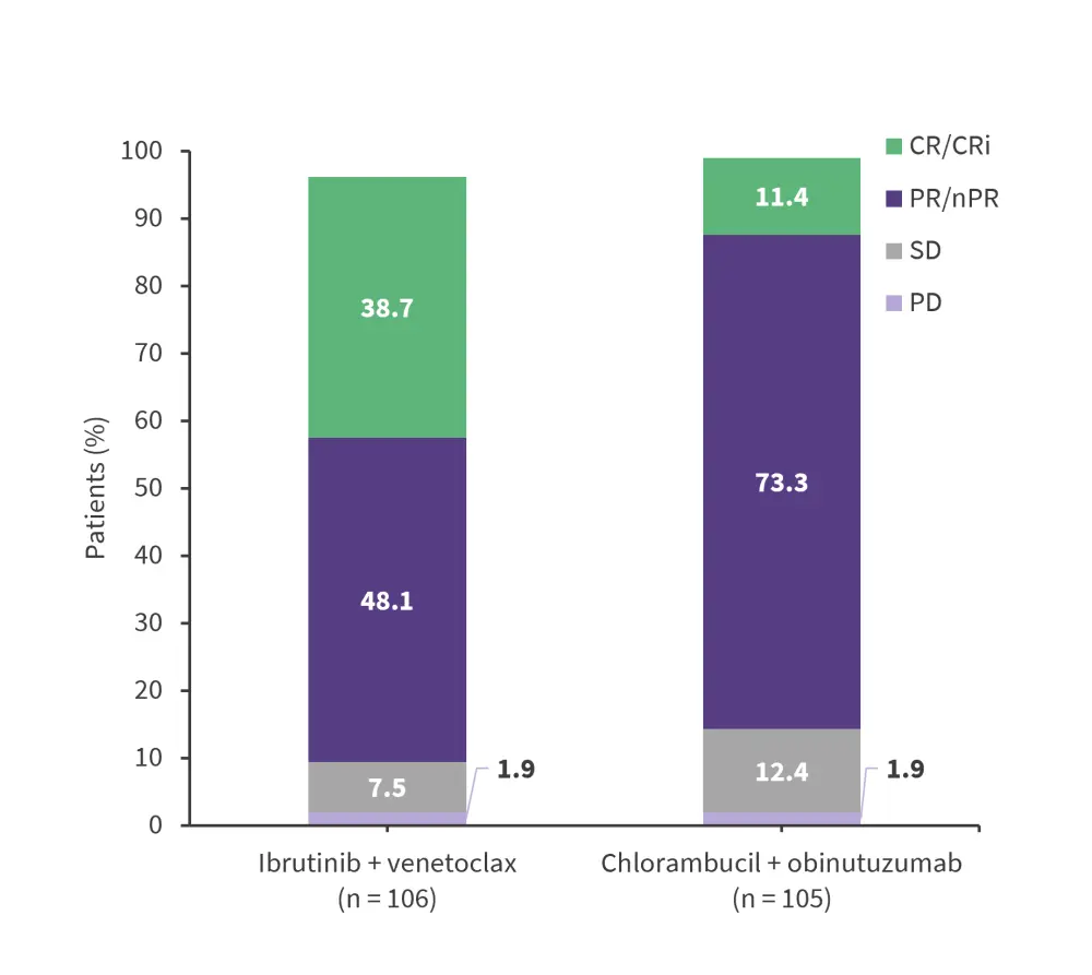 The primary endpoint of PFS was met. With a median follow-up of 27.7 months, there were 22 PFS events for ibrutinib + venetoclax and 67 events for chlorambucil + obinutuzumab. PFS was significantly longer for ibrutinib + venetoclax than for chlorambucil + binutuzumab (HR, 0.216; 95% CI, 0.131−0.357; p = 0.001). Higher response rates were observed in the ibrutinib + venetoclax cohort vs the chlorambucil + obinutuzumab cohort (Figure 2).