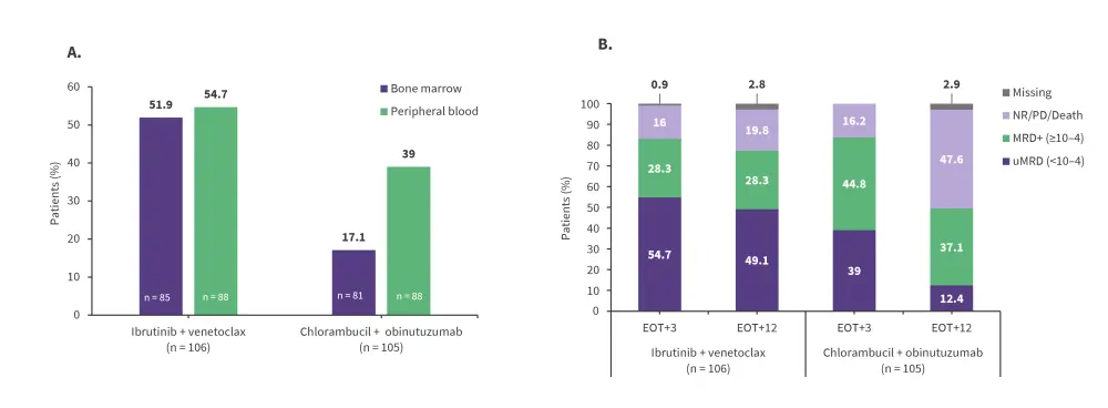 Furthermore, best undetectable minimal residual disease (uMRD) rate in bone marrow by next-generation sequencing (NGS) at the time of the primary analysis was significantly higher for patients treated with ibrutinib + venetoclax than those treated with chlorambucil + obinutuzumab (55.7% vs 21.0%; p < 0.001). At 3 months after the end of treatment, the proportion of patients in the ibrutinib + venetoclax arm who achieved uMRD in bone marrow was significantly higher vs patients in the chlorambucil + obinutuzumab arm (Figure 3A).