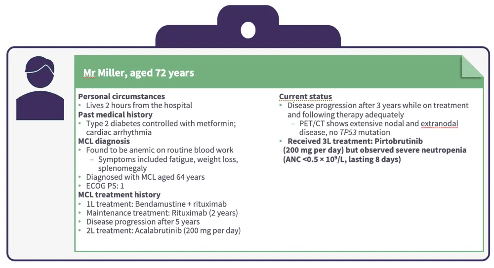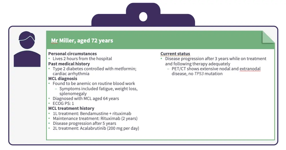 Jurczak first presented a patient case of a male aged 72 years with MCL who progressed while on treatment with second-line acalabrutinib (Figures 1 and 2).