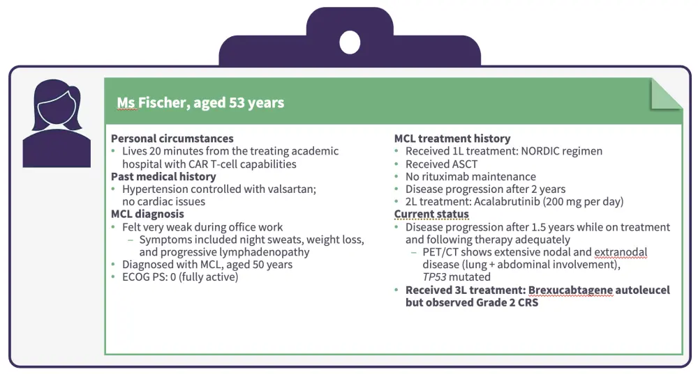 Jurczak then presented a patient case of a female aged 53 years with MCL who progressed while on treatment with second-line acalabrutinib (Figures 3 and 4).