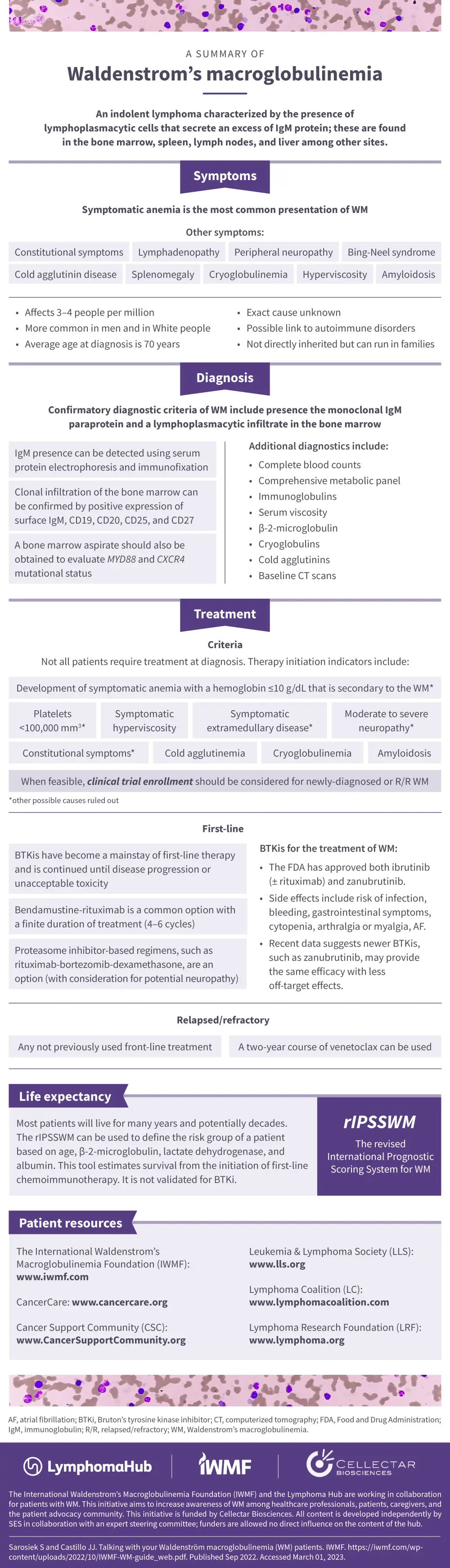 The International Waldenstrom’s Macroglobulinemia Foundation (IWMF) developed a reference guide to assist communication between HCPs and patients with WM to address this unmet need. As part of our ongoing partnership with the IWMF, the Lymphoma Hub is happy to present a concise quick reference guide to assist time-pressed HCPs treating patients with WM.