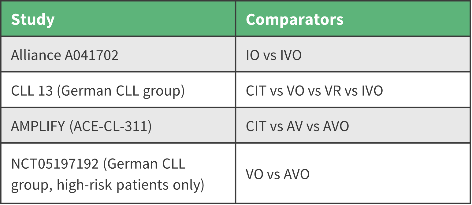 Figure 1. Doublet and triplet phase III studies and their comparator arms in patients with CLL*