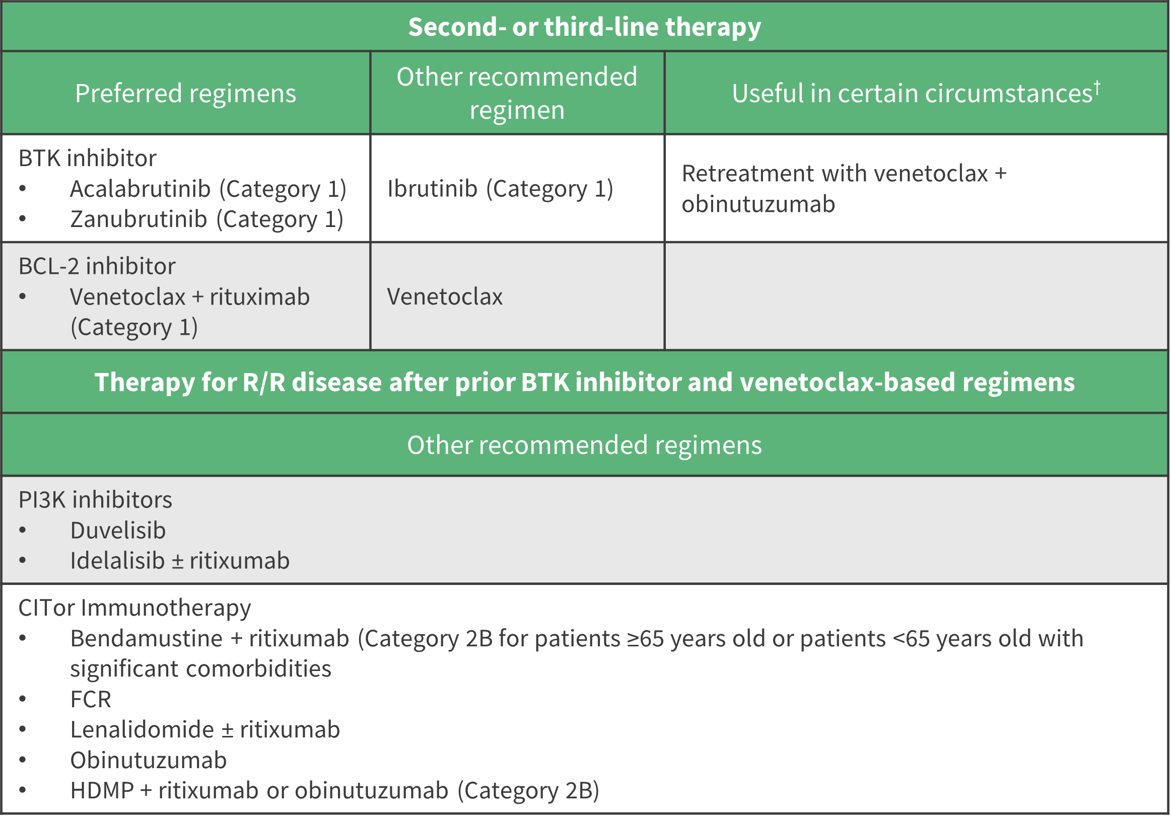 BCL-2, B-cell lymphoma 2 protein; BTK, Bruton’s tyrosine kinase; FCR, fludarabine, cyclophosphamide, rituximab; HDMP, high dose methylprednisolone; PI3K, phosphoinositide 3-kinsae; R/R, relapsed/refractory.