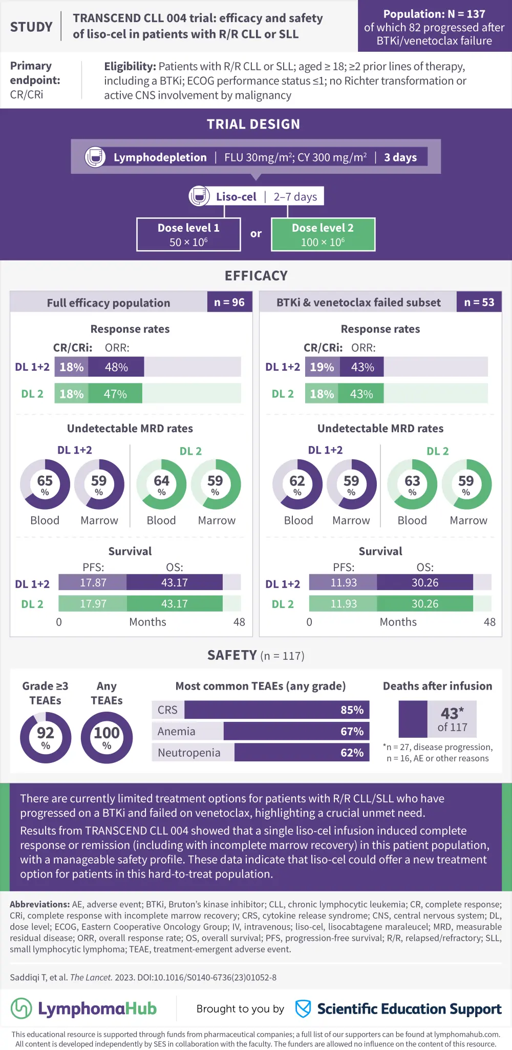 Despite advancements in the therapeutic landscape, there remains an unmet need for patients with relapsed/refractory (R/R) chronic lymphocytic leukemia (CLL) and small lymphocytic lymphoma (SLL), especially after progression from Bruton’s kinase inhibitors (BTKi) or venetoclax failure.1 In the phase I/II TRANSCEND CLL 004 dose-escalation study, lisocabtagene maraleucel (liso-cel) was investigated at two doses in patients with R/R CLL or SLL and a subset of patients who had progressed after BTKi and failed venetoclax treatment.1