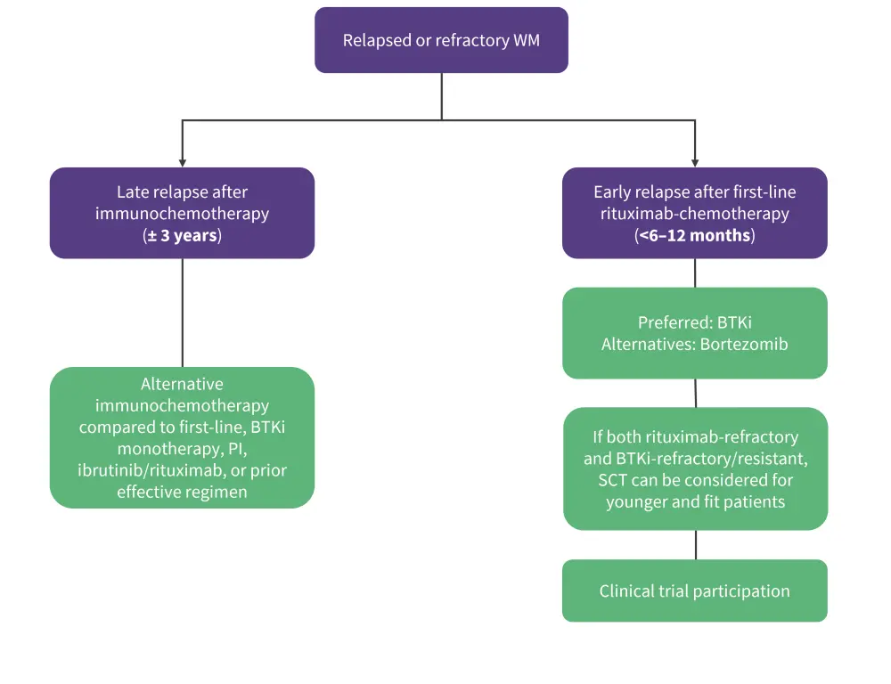 Current treatment options for R/R WM include immunochemotherapy, proteasome inhibitors, and Bruton’s tyrosine kinase inhibitors (BTKis).