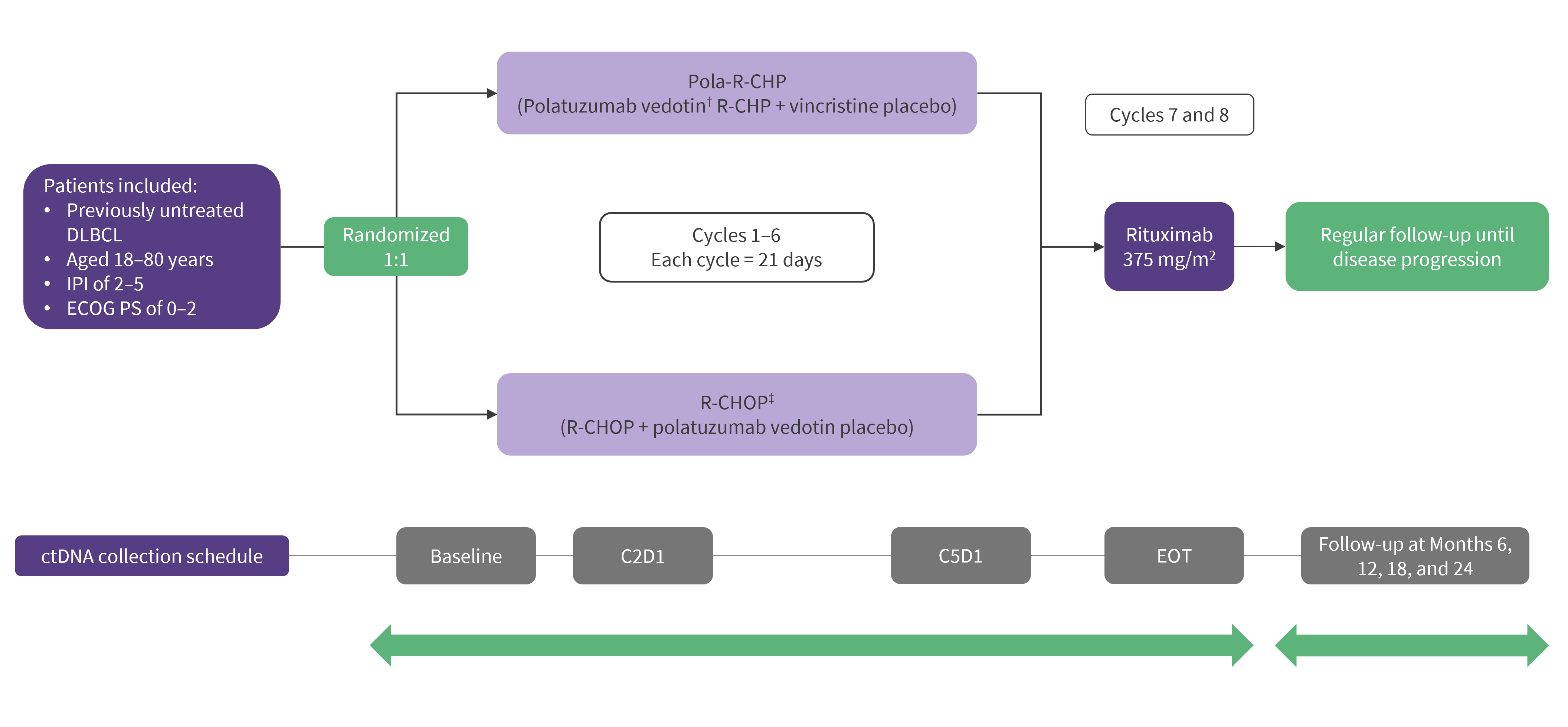 The POLARIX study included patients with previously untreated intermediate- to high-risk DLBCL. Patients were randomized to receive pola-R-CHP or R-CHOP, with plasma samples collected at various timepoints for ctDNA assessment (Figure 1).