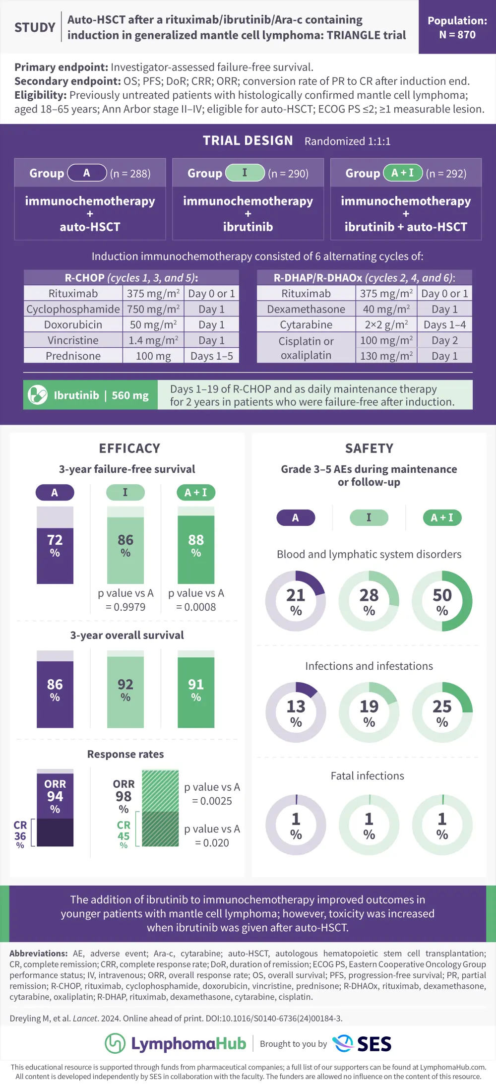The Lymphoma Hub is pleased to present a visual abstract summarizing results from the phase III TRIANGLE trial (NCT02858258) assessing the safety and efficacy of the addition of ibrutinib, a Bruton’s tyrosine kinase inhibitor, to standard immunochemotherapy with or without autologous hematopoietic stem cell transplantation (auto-HSCT) in younger patients with mantle cell lymphoma. Results from this trial were published by Dreyling et al.1 in The Lancet.
