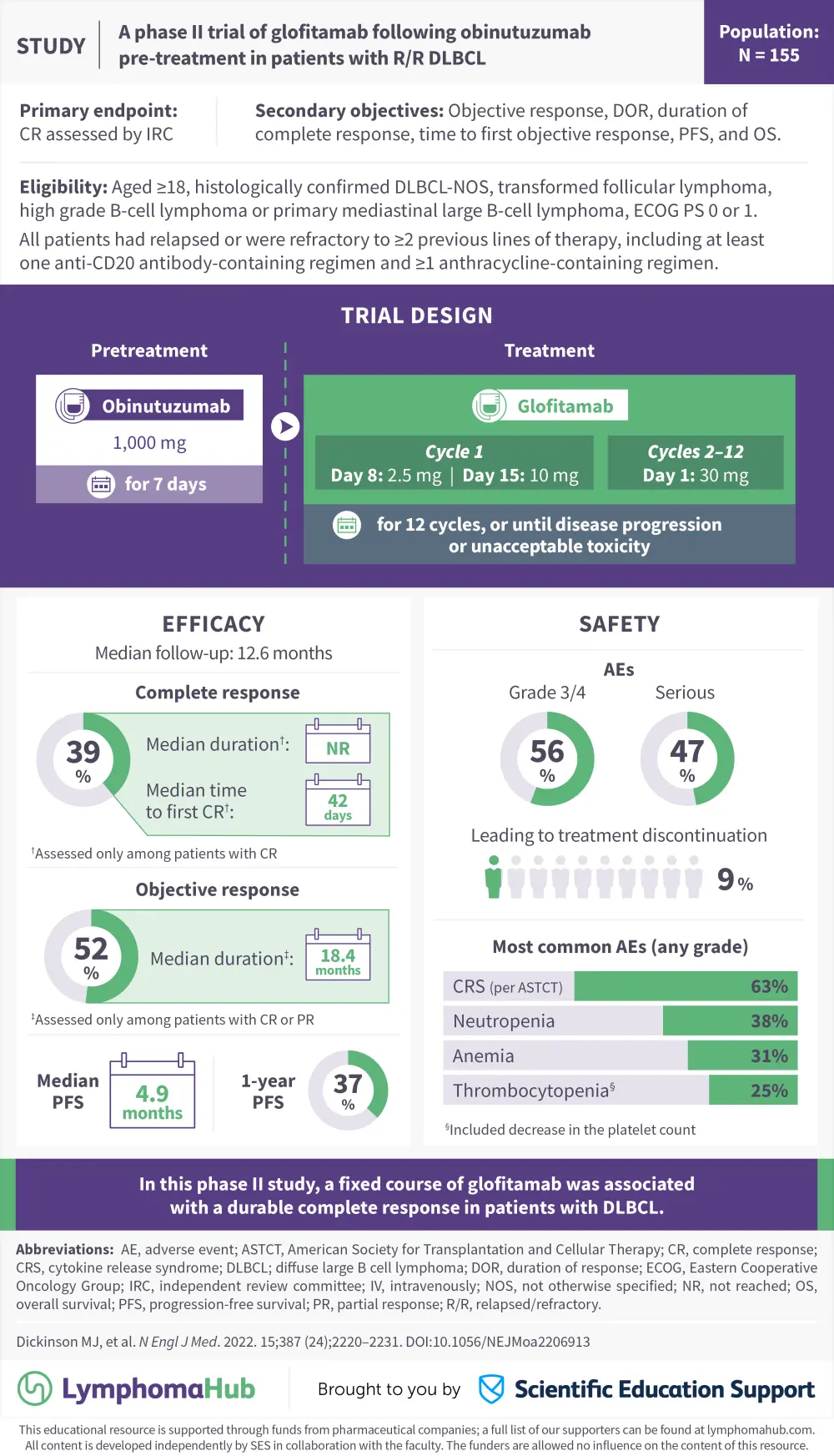 The Lymphoma Hub is delighted to present a visual abstract summarizing key data from a phase II trial (NCT03075696) investigating the safety and efficacy of fixed-duration glofitamab monotherapy following pretreatment with obinutuzumab in adult patients with relapsed/refractory diffuse large B-cell lymphoma.