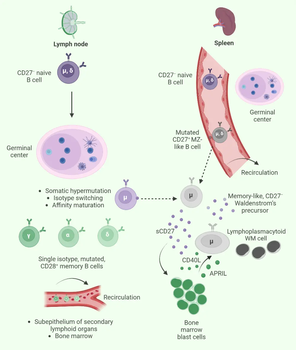 WM develops when lymphoplasmacytic cells become abnormal and secrete an excess of IgM protein.4 The pathophysiology of WM involves the presence of infiltrated lymphoplasmacytic cells in the bone marrow, spleen, lymph nodes, and liver among other sites (Figure 2).