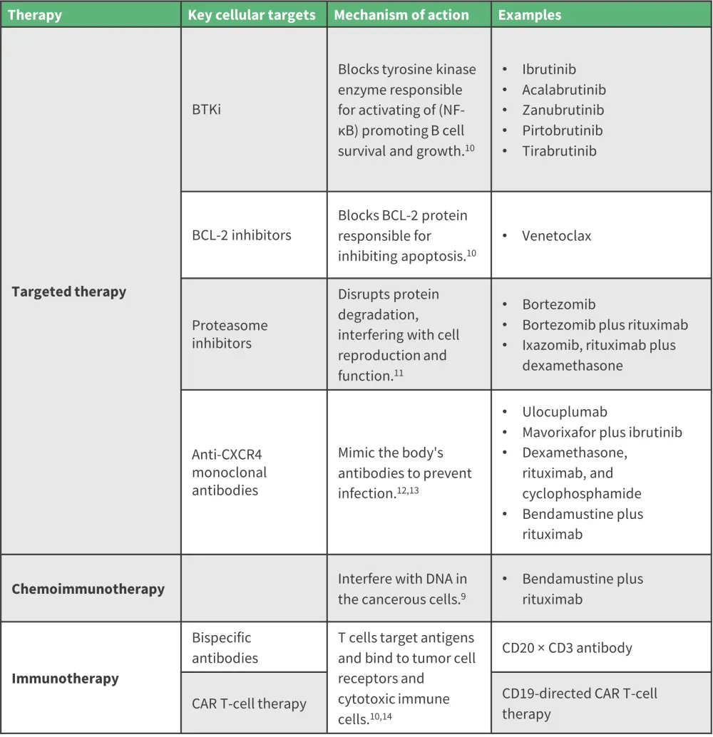 Treatment options have progressed in WM since advancements in high-technology sequencing have improved the understanding of the molecular landscape of WM.8 Bruton’s tyrosine kinase inhibitors have paved the way for the successful treatment of patients with newly diagnosed and relapsed/refractory WM.9 More emerging treatments are on the horizon, including chimeric antigen receptor T-cell therapy, novel B-cell lymphoma 2 inhibitors, proteasome inhibitors, and monoclonal/bispecific antibodies (Figure 4).