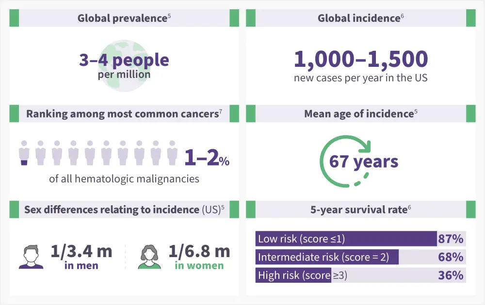 Patients with 0–1 risk factors (excluding older age) are associated with low-risk disease and a median survival of 10 years. Two risk factors or older age alone are associated with intermediate-risk disease and a median survival of ≥8 years. Three or more risk factors are associated with high-risk disease and a median survival of 3.5 years.