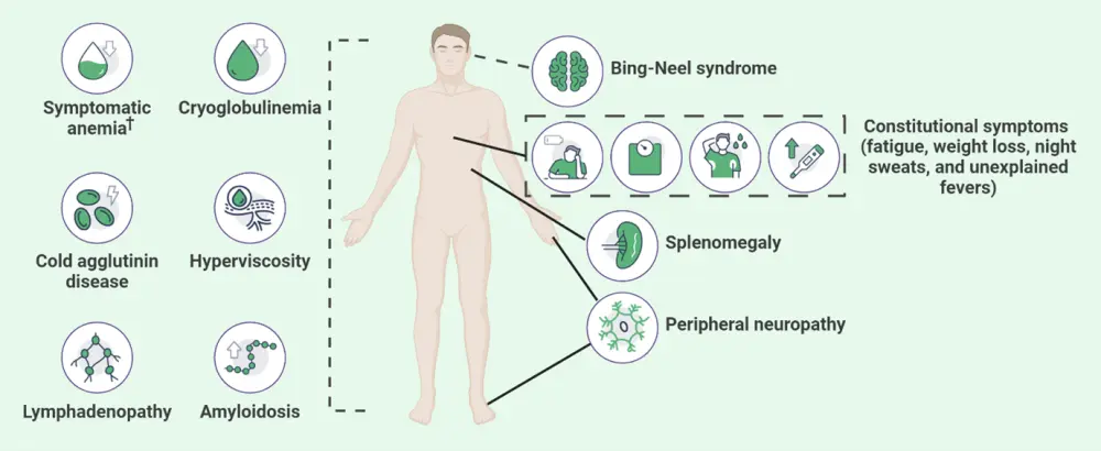 Not all patients with WM require treatment at the time of diagnosis. The criteria for treatment initiation include4: